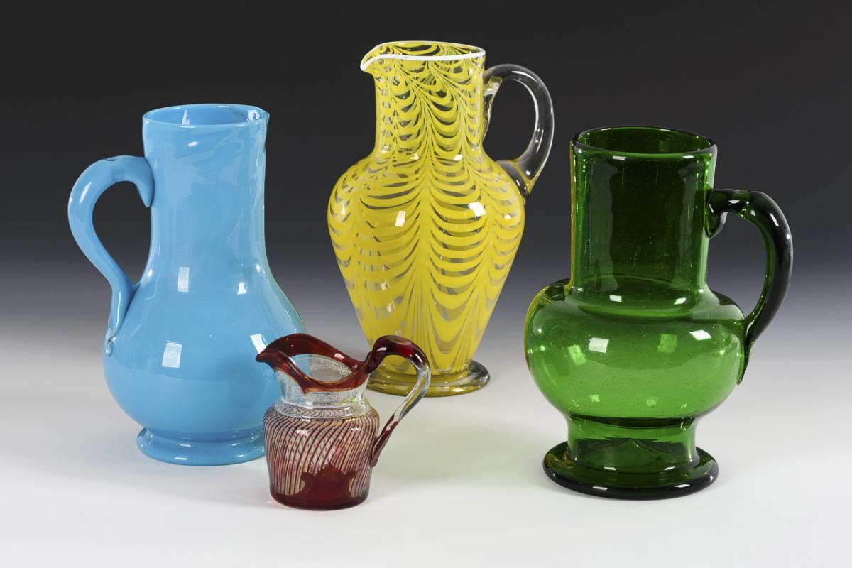 Blue milk glass jug (h 25 cm), jug made of green glass (h 25 cm), jug made of clear glass with opal yellow threads and white enamel rim (h 26 cm), milk jug made of clear, red-stained glass (h 11.5 cm). Gold of the milk jug rubbed.