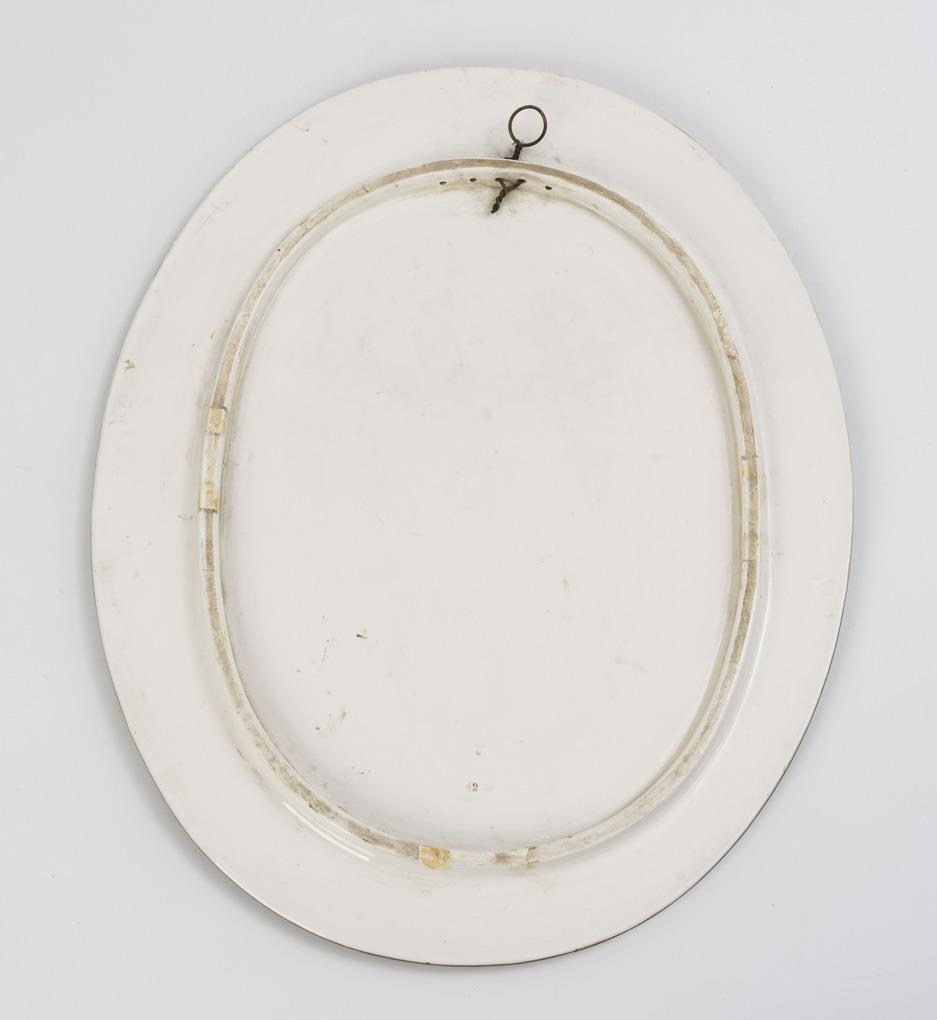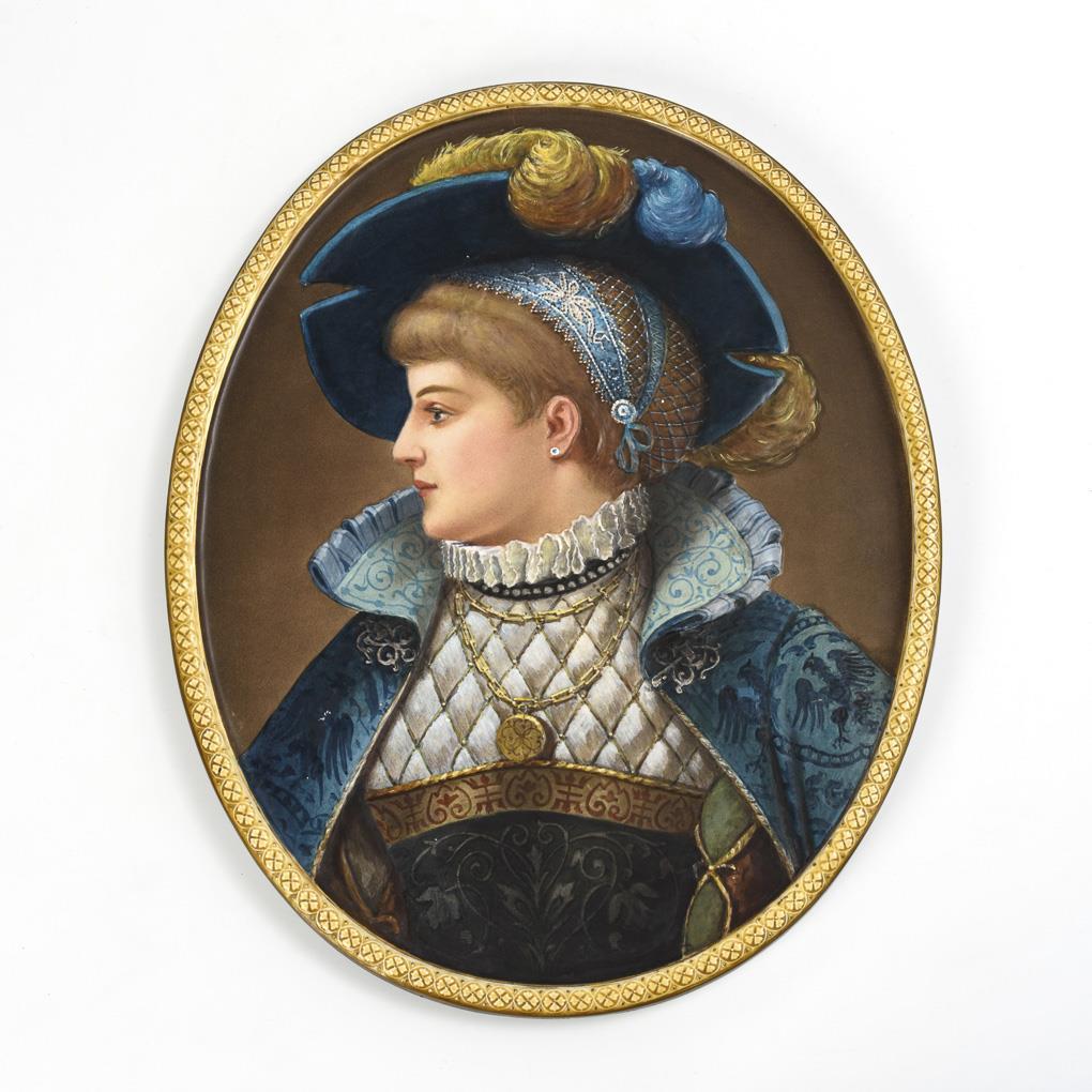 Oval relief painting with the historicizing profile of a lady in a blue robe and feathered hat.
