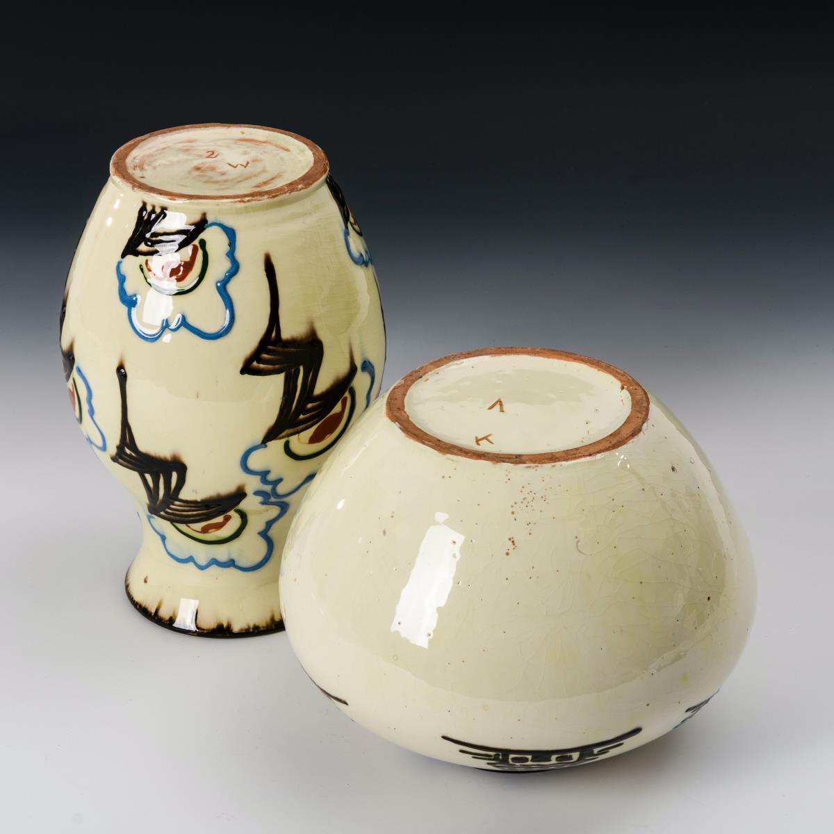 Vase in Birnform (H 23 cm) und bauchig-gedrückte Vase (H 17 cm) mit stilisierter Flora und Fauna sowie Architektur.