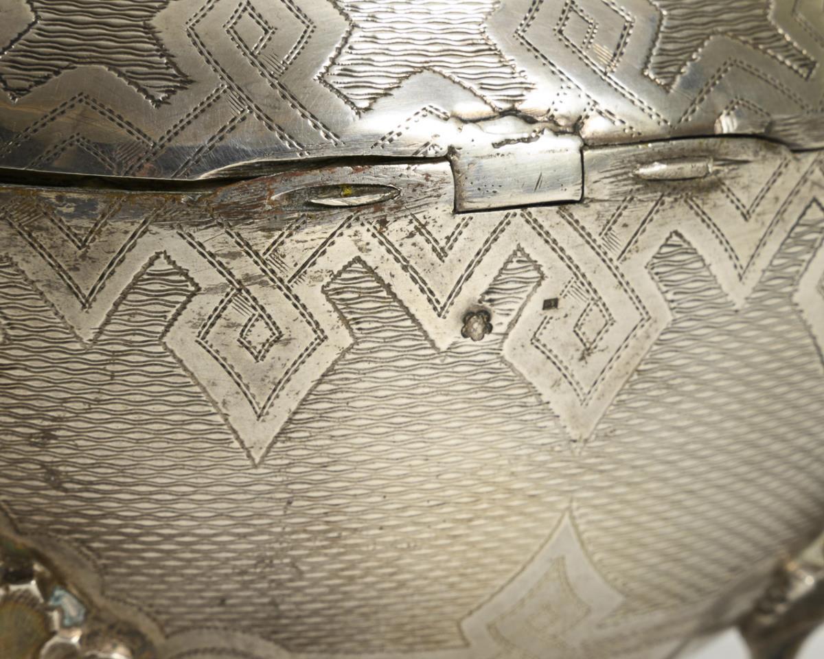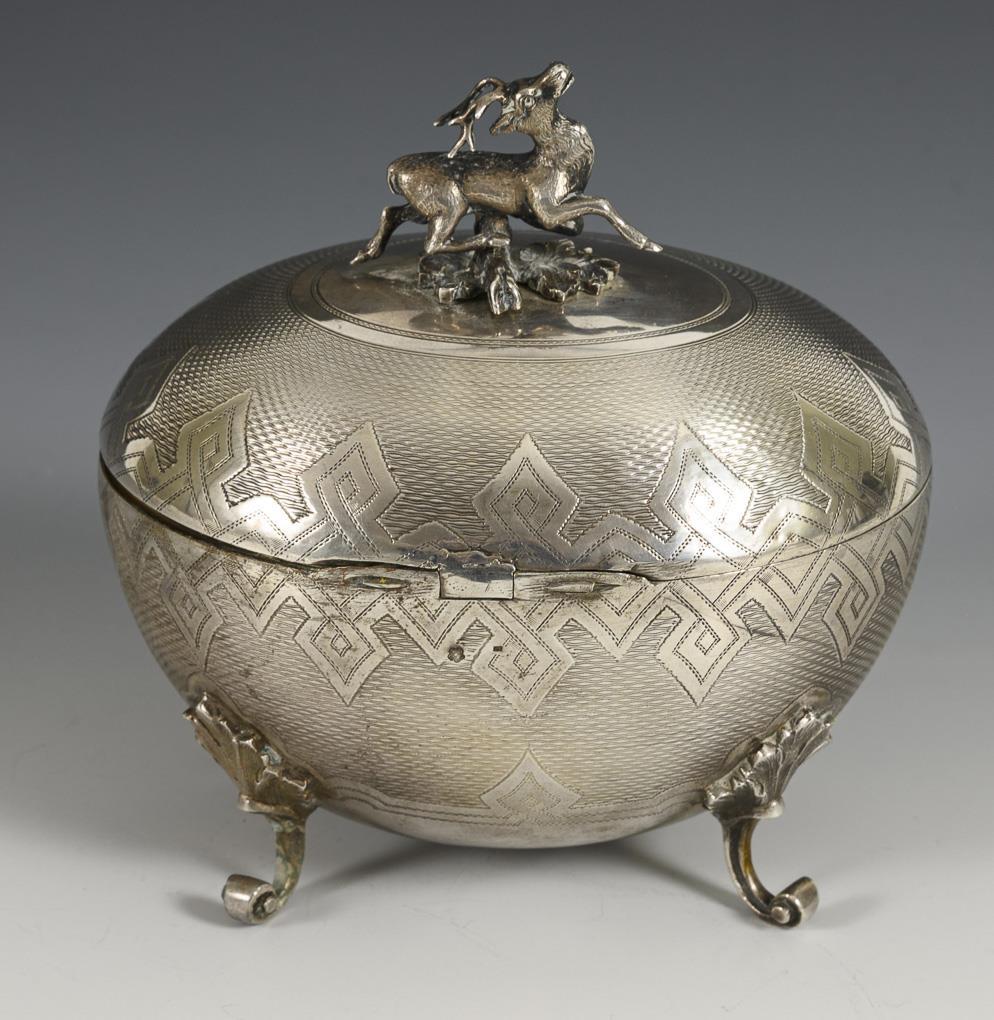 Ovoid, lockable body with sculpted stag pommel, fine engravings and curved feet. 1 key. Hinge old repairs, lock jams slightly.