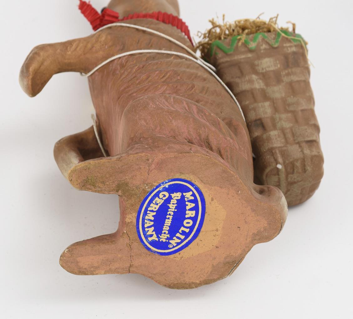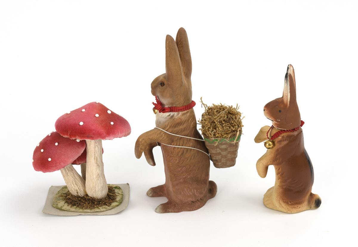 Standing rabbits with removable heads, as candy boxes (H 17/21 cm). With 3 toadstools with velvet-covered heads (H 12 cm). Hardly any signs of age.