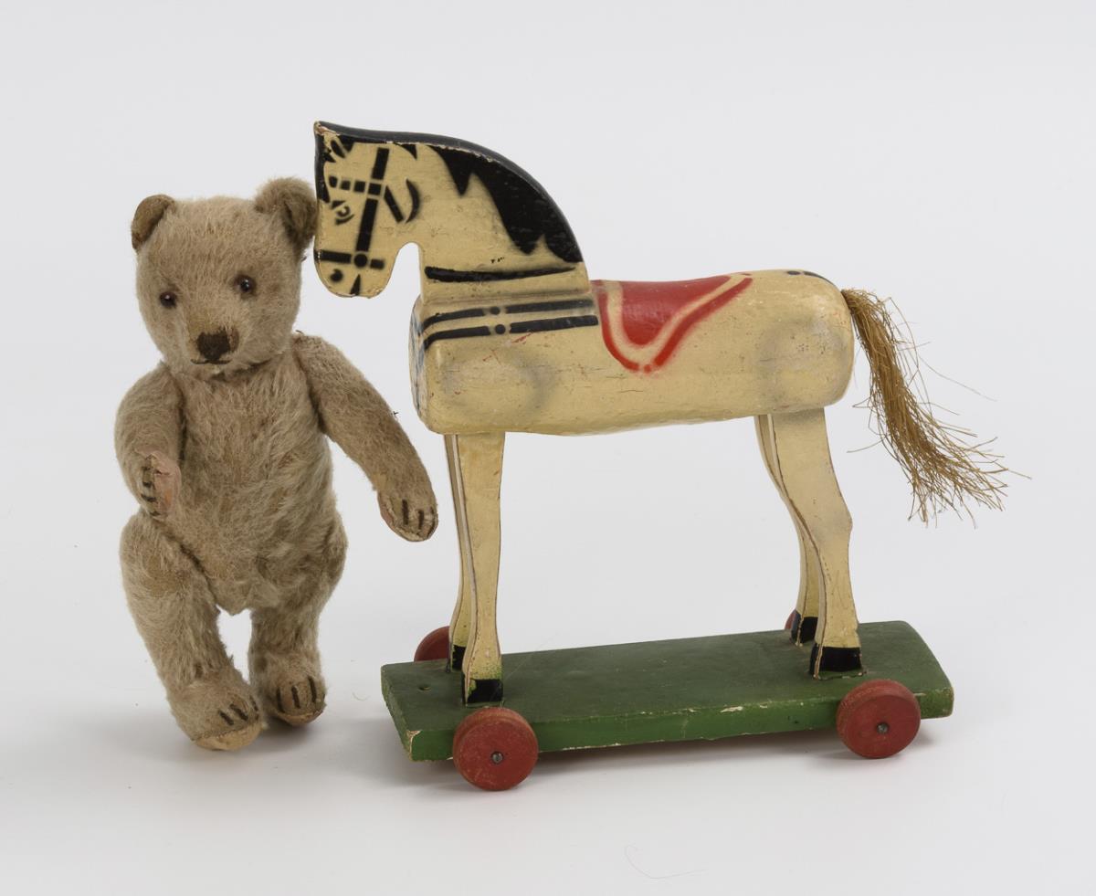 Small wheeled horse and original Steiff teddy.