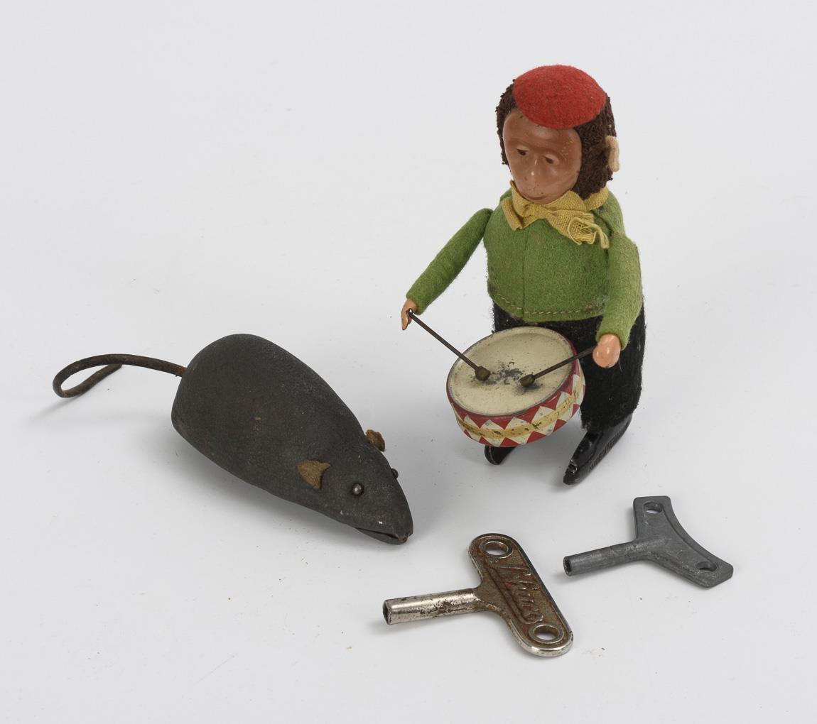 Monkey with felt clothing as drummer (985/1), with intact movement. H 11.5 cm. / Gray mouse, No. 1022, with intact movement. L 8.5 cm (without tail). Comes with 2 keys. Signs of age, tail of the mouse glued at the base.