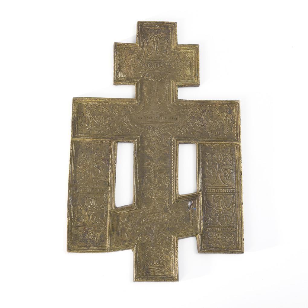 House cross with the crucified, flanked by Martha, Mary, John and Longinus; God the Father above the cross. Verso tree of life "engraving". Small losses to the enamel.