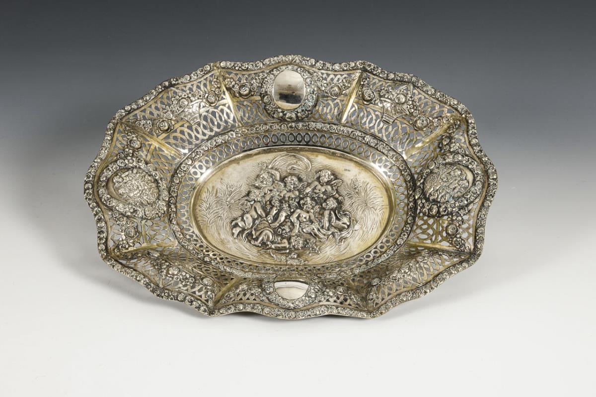 Oval, richly reliefed bowl with putti and open-worked rim.