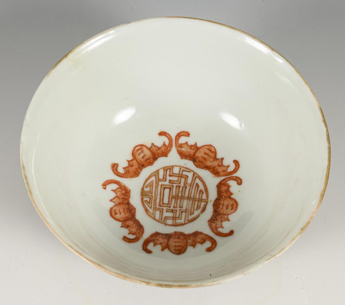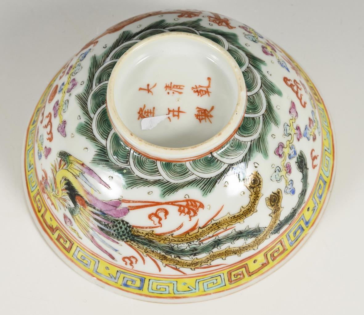 Translucent porcelain with fine painting. Characters and bats in the mirror. Outer wall with phoenix and dragon. Microchips on the upper rim.