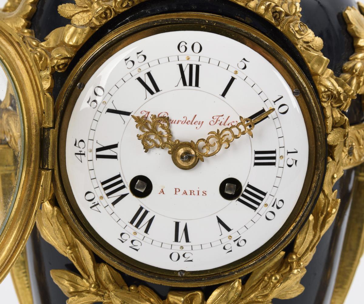 Swiss movement with lever escapement and half-hour strike on bell, keywind. Functional in short time test. White enamel dial inscribed "A. Beurdeley Fils à Paris" with Roman and Arabic numerals, minute ring and Louis Quinze hands.