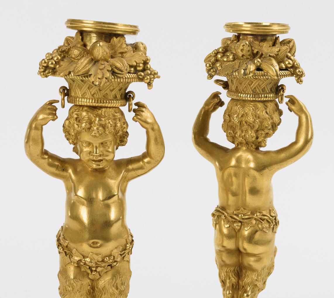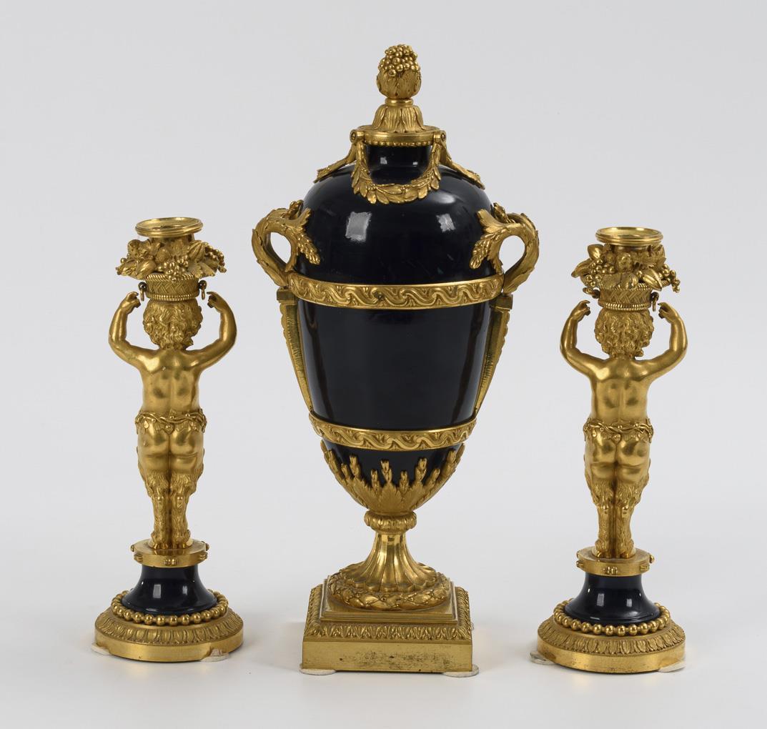 Louis Seize-style pendulum in the shape of a vase or urn with rich floral decoration and removable lid, on a round base with square plinth. With two single-flame candlesticks in the shape of sculptural faun boys on a round base. Minimal signs of age and wear.