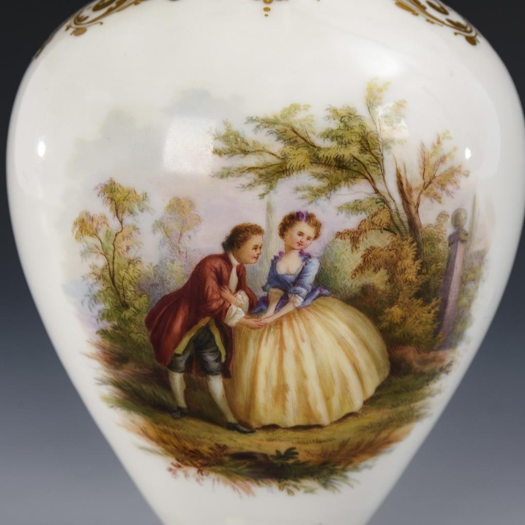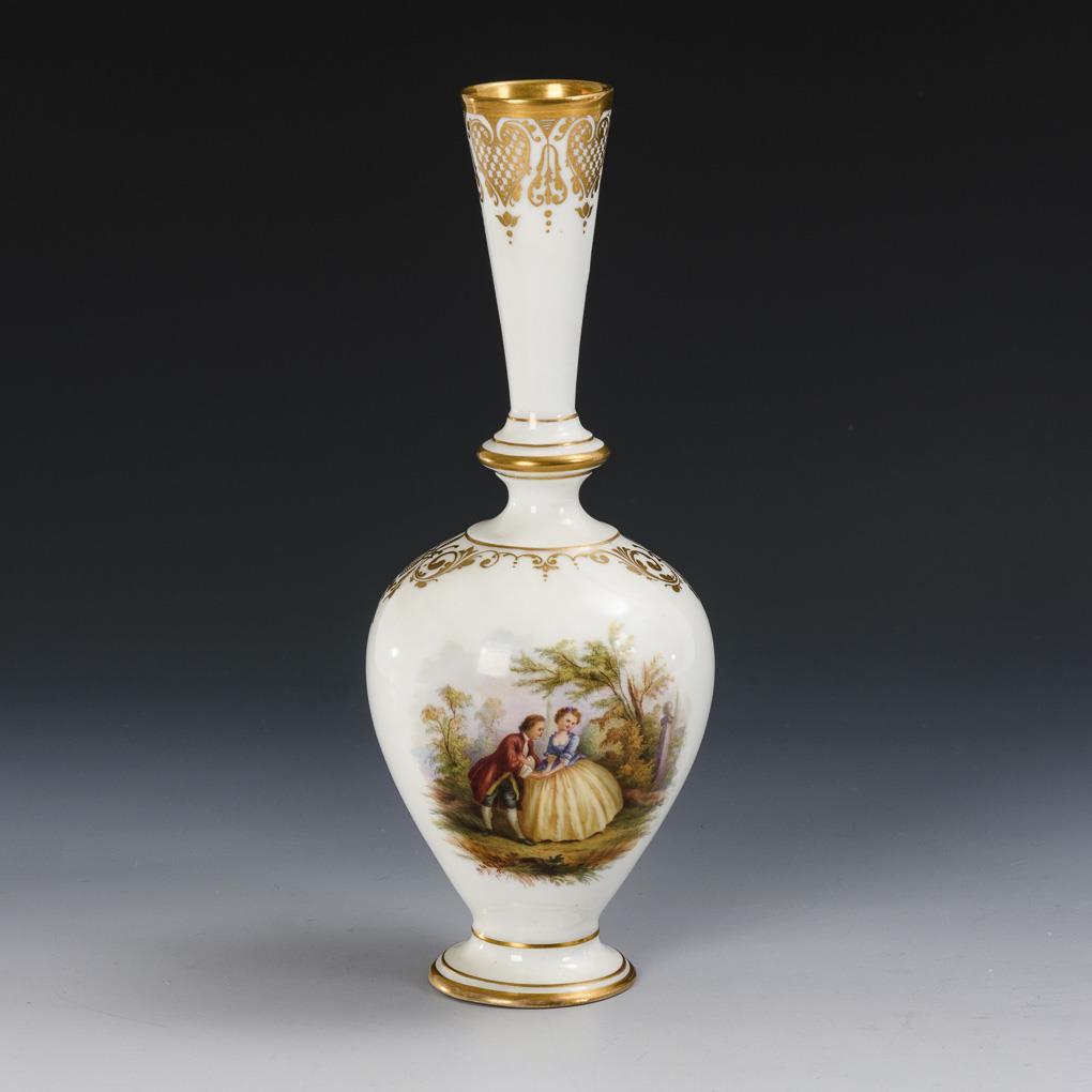 Baluster body with slender funnel neck, round base. On the front the finely painted depiction of a gallant couple in a park landscape, on the reverse a bouquet of flowers.