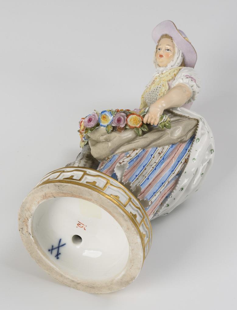 Rococo gardener standing at a tree stump with a garland of flowers. Partially chipped flowers and leaves.