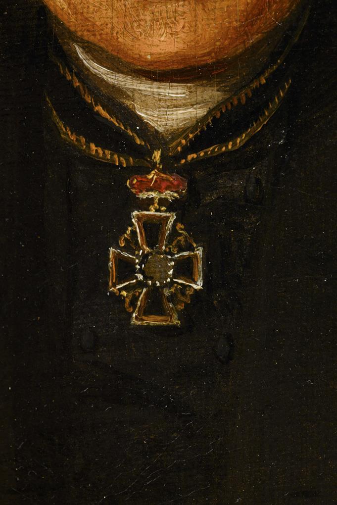 Portrait of an elderly man in black clothing with finely painted medals against a neutral background. Slight traces of age.