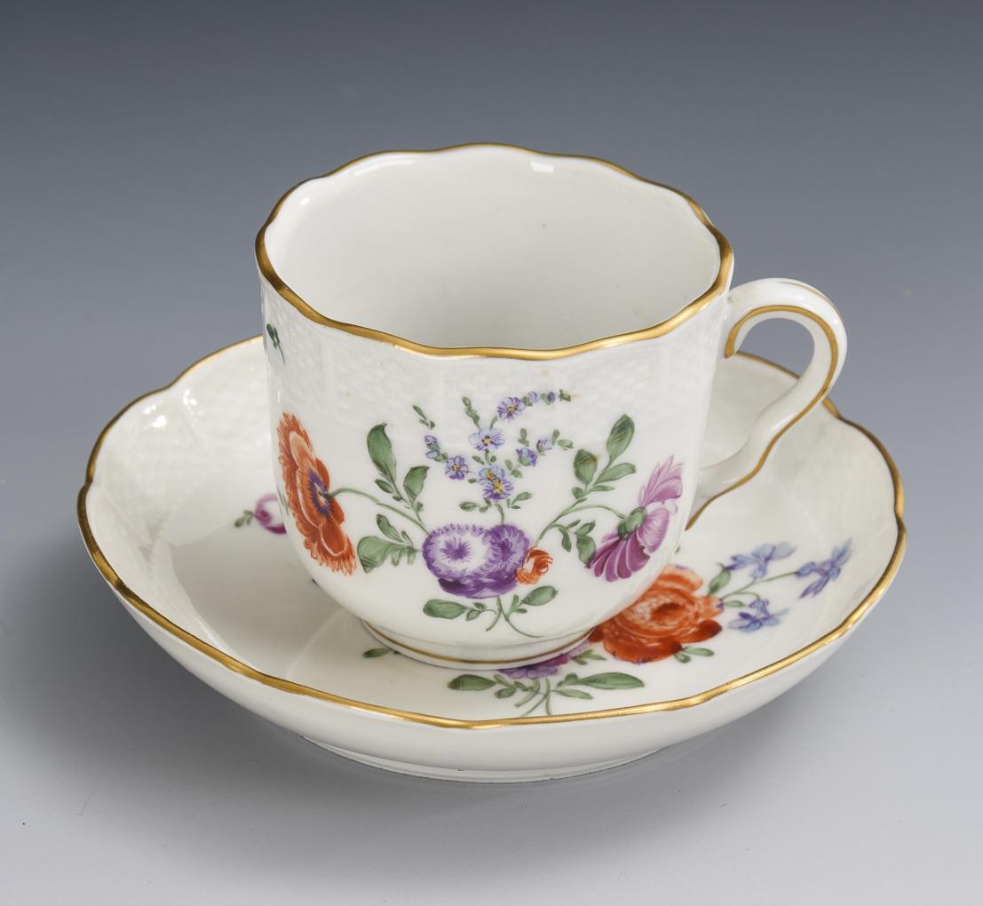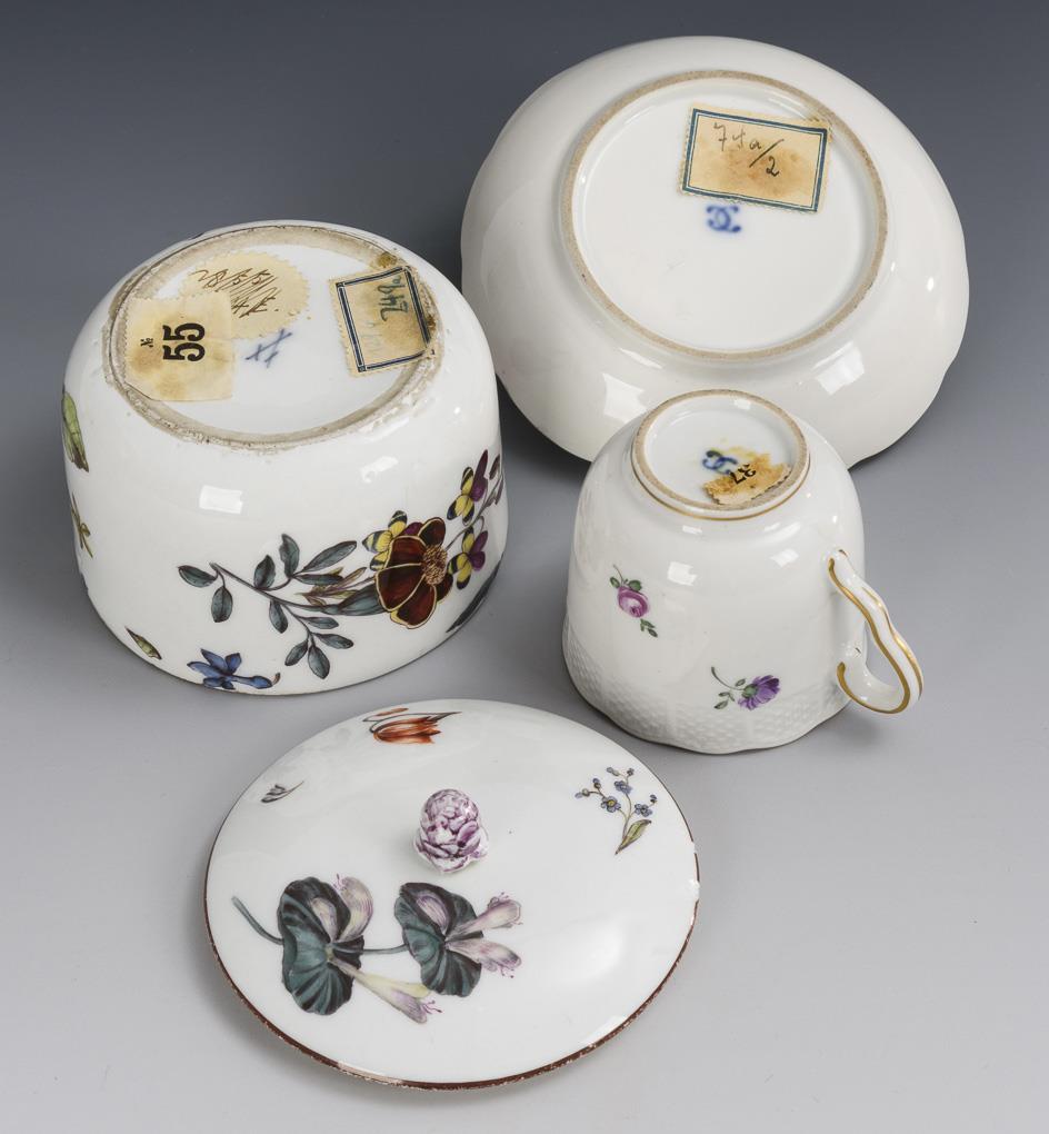 1x Meissen, around 1750: Sugar bowl with flower knob lid and woodcut flowers (h 9 cm). / 1x double C mark, 19th century: cup (h 6 cm) and saucer (Ø 12 cm) with alto decor relief and flower painting.