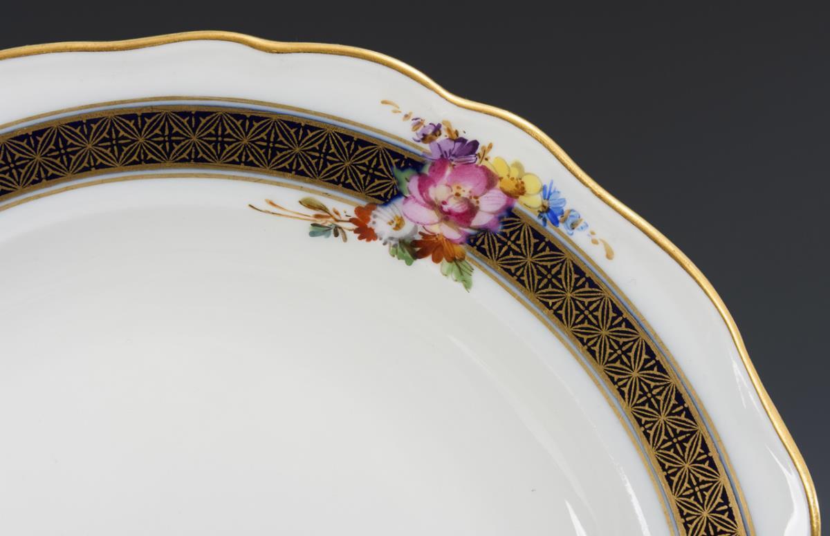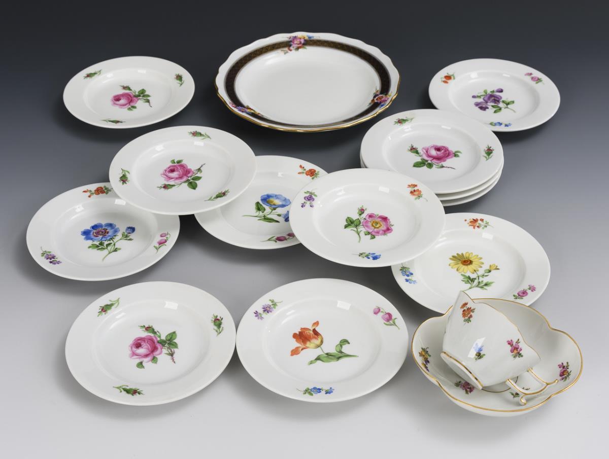 12 small plates, 1 quatrefoil cup and 1 cake plate. Meissen.