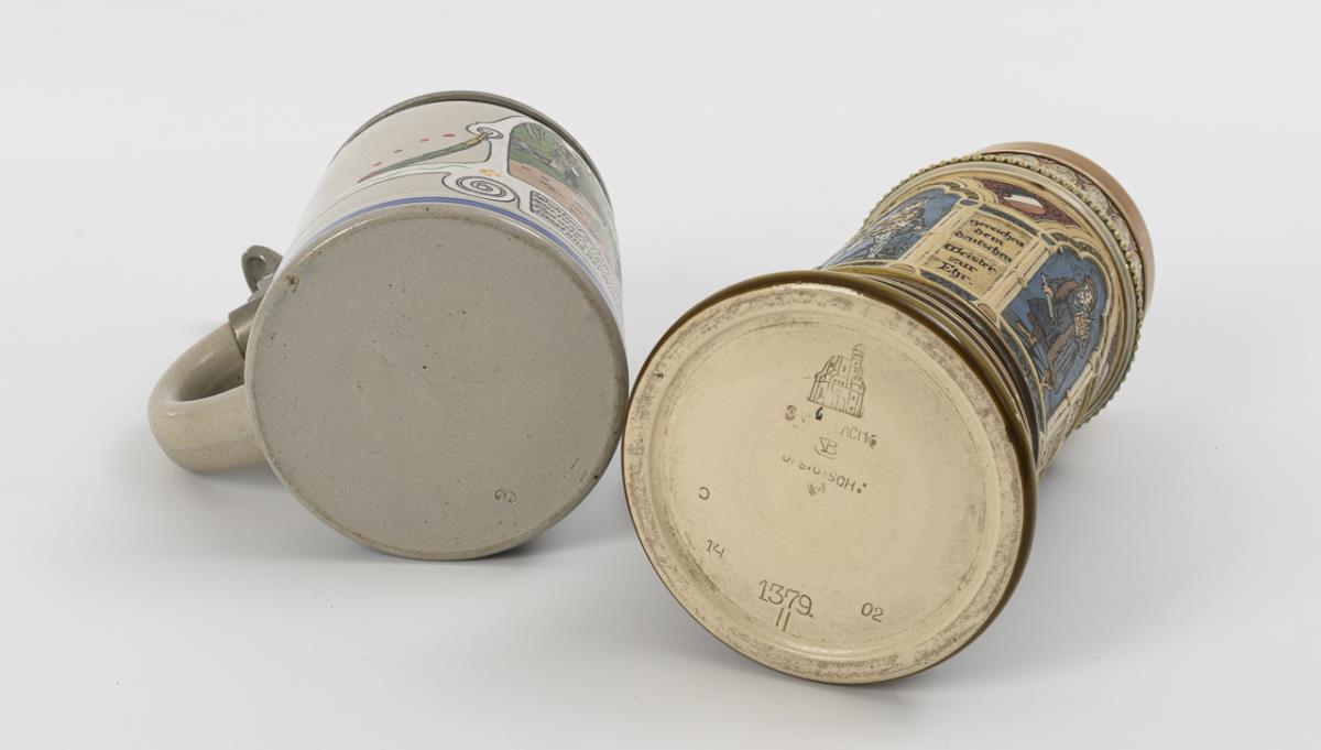 Relief jug with historicist decoration, niche figures and sayings on the art of architecture (h 19 cm). Grey beer mug with colorful farewell motif and the first lines from the "Lied der Franken", pewter lid with shell pusher, engraved and dated 1908 (H 16 cm).