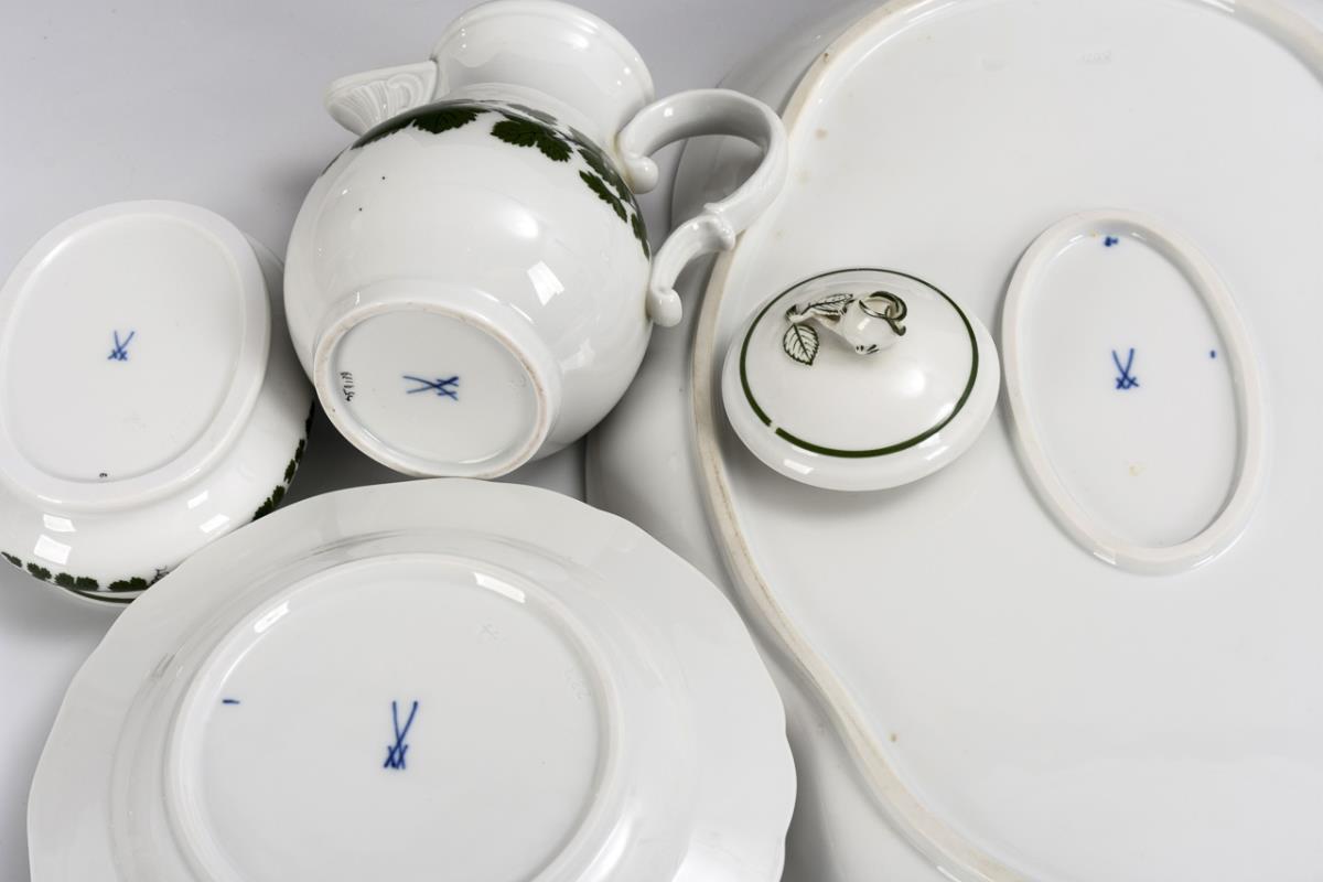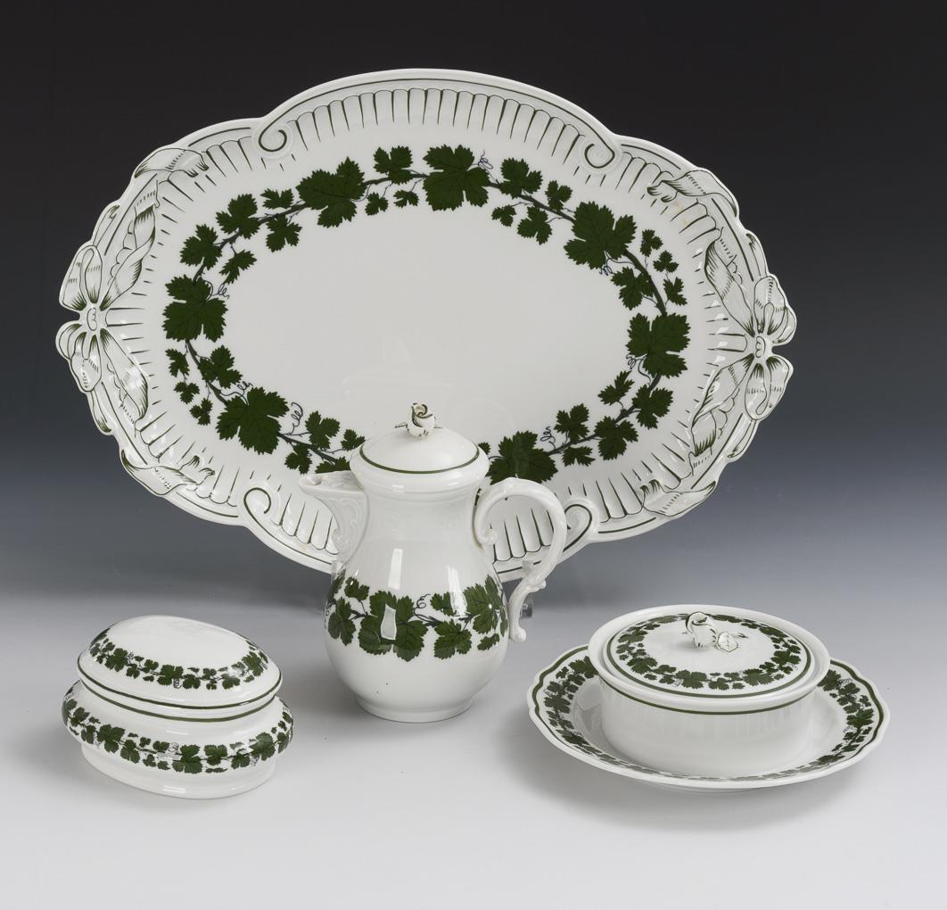 Predominantly "New cut-out" form. Mocha pot (H 16 cm), oval jar (L 12 cm), butter dish (Ø 17.5 cm) and bow tray (L 40 cm). Bump and sanded bump on the lid of the pot.