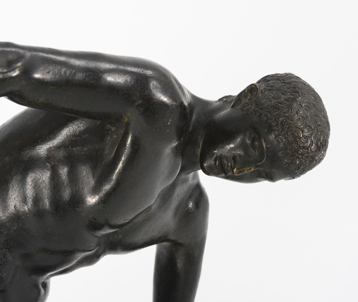 Finely executed discus thrower on a rectangular bronze plinth and with the support of a Roman marble copy. Damage to the patina, plinth warped.