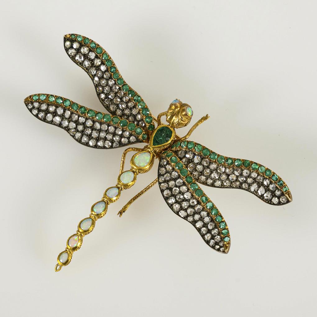 Large dragonfly brooch with emeralds, old-cut diamonds and opals.