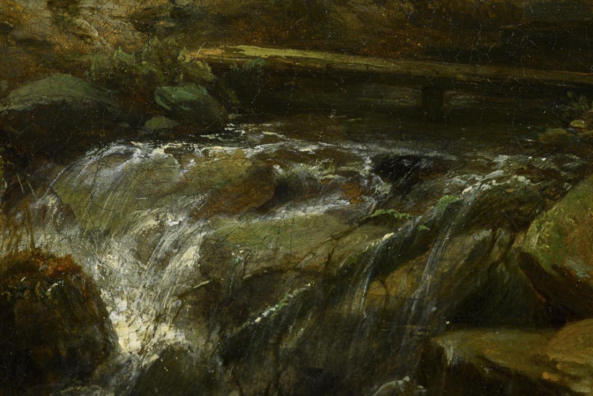 Detailed mountain landscape with a small waterfall between large rocks below a hut in the light of the moon. Traces of age.