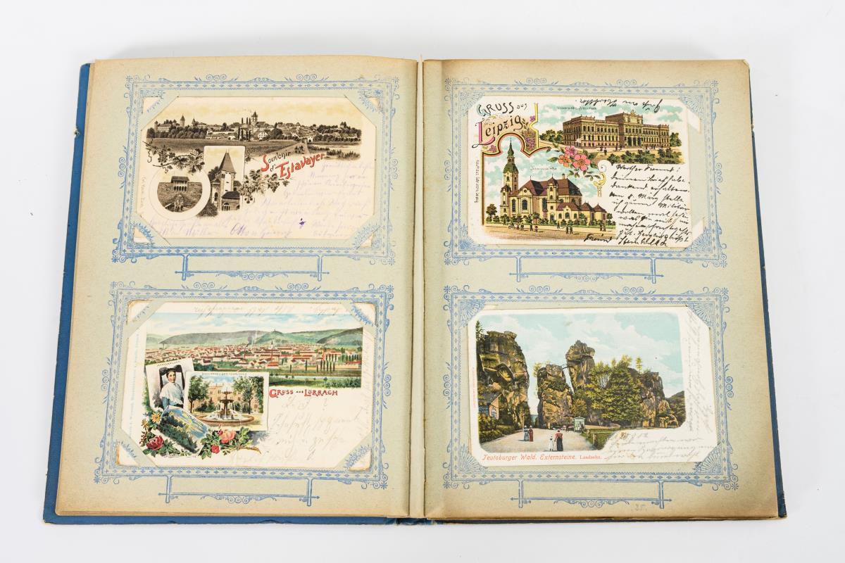 Karten um 1900. Gute Alben mit hochwertigen Karten. Gleichgroße Alben in Rot, Blau und Braun.
