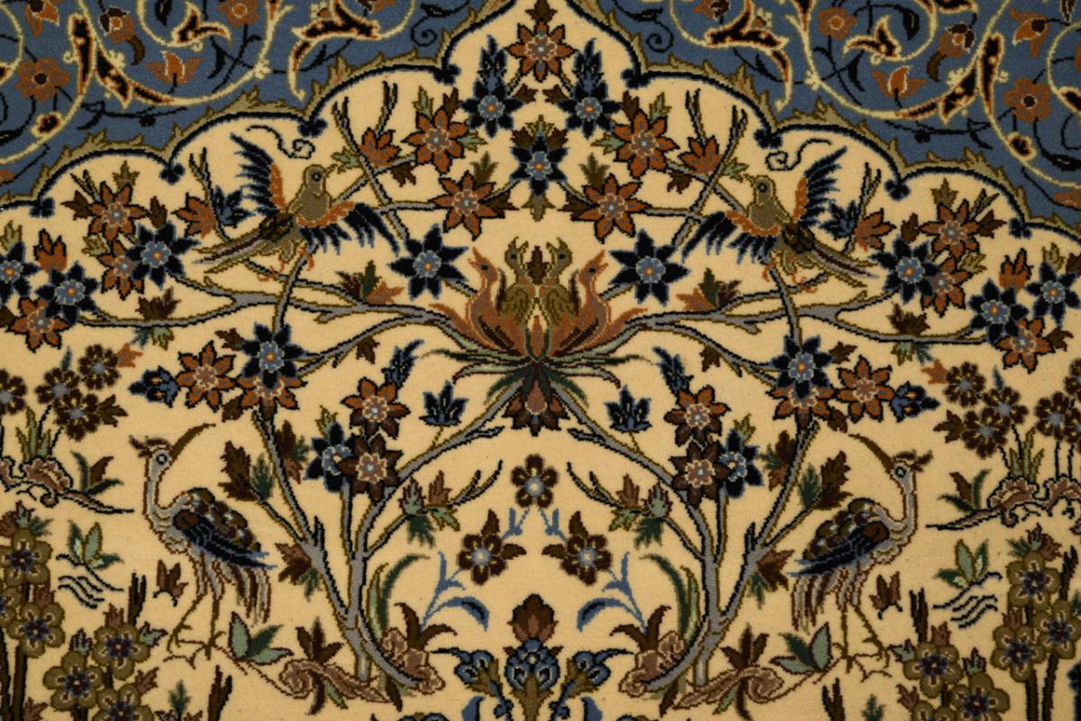 Curved mihrab with an ivory-colored ground, featuring a vase motif with magnificent floral scroll decoration and animals. Blue-ground spandrels with spiral tendrils. Multi-row border with palmettes and animal motifs. Eyelets for suspension on the reverse, leather-reinforced long sides.