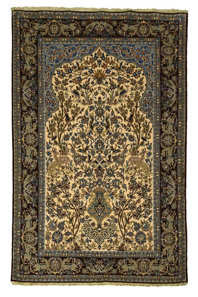 Curved mihrab with an ivory-colored ground, featuring a vase motif with magnificent floral scroll decoration and animals. Blue-ground spandrels with spiral tendrils. Multi-row border with palmettes and animal motifs. Eyelets for suspension on the reverse, leather-reinforced long sides.