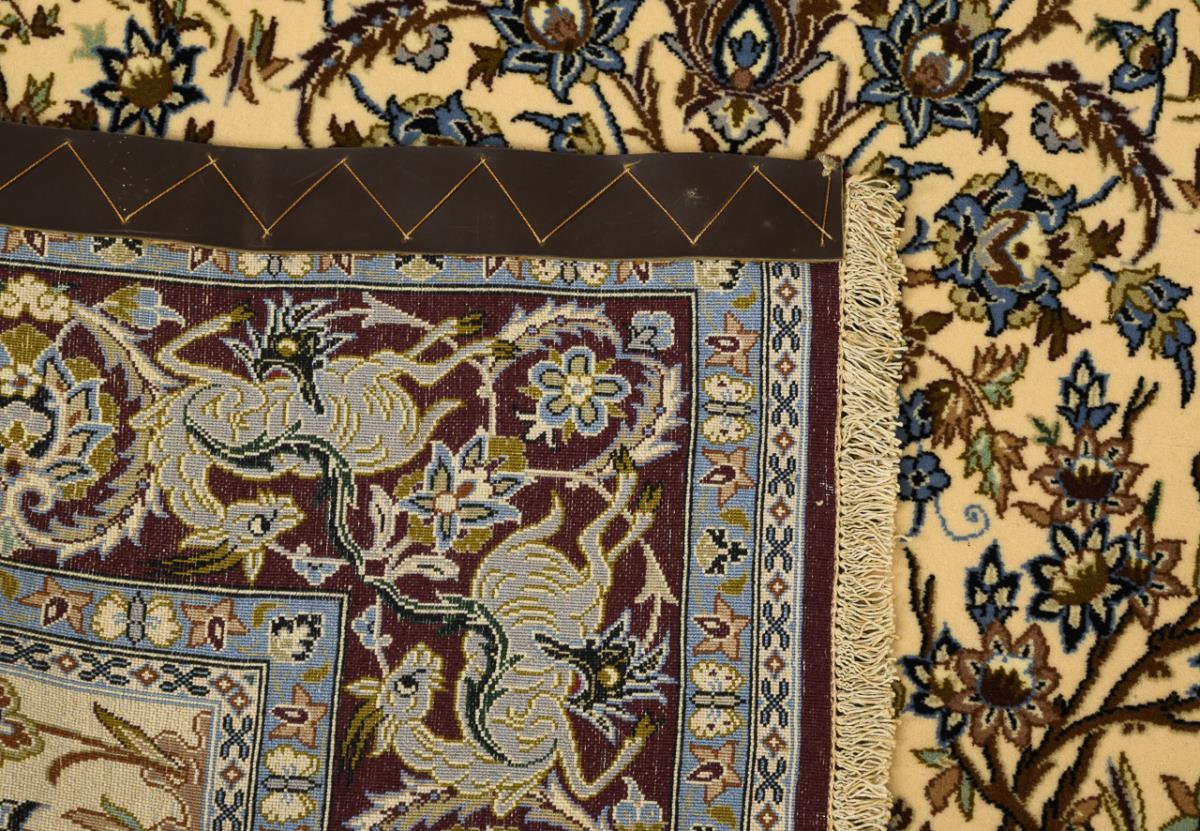 Cotton and wool, finely hand-knotted. Polychrome decoration with predominantly purple-tinged red, blue and ivory. Approx. 174 x 111 cm.