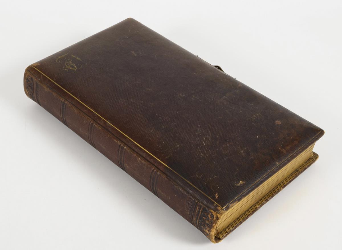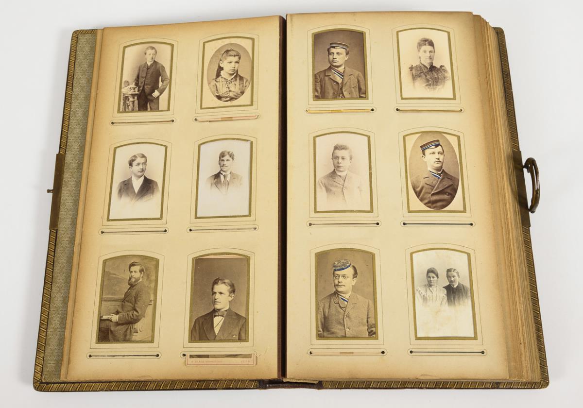Brown leather binding with brass clasp and gilt edges as well as fraternity circle, on the endpaper dedication Jena 1900, title page with painted fraternity coat of arms, student photos partly colored. 40 x 23 x 7.5 cm.