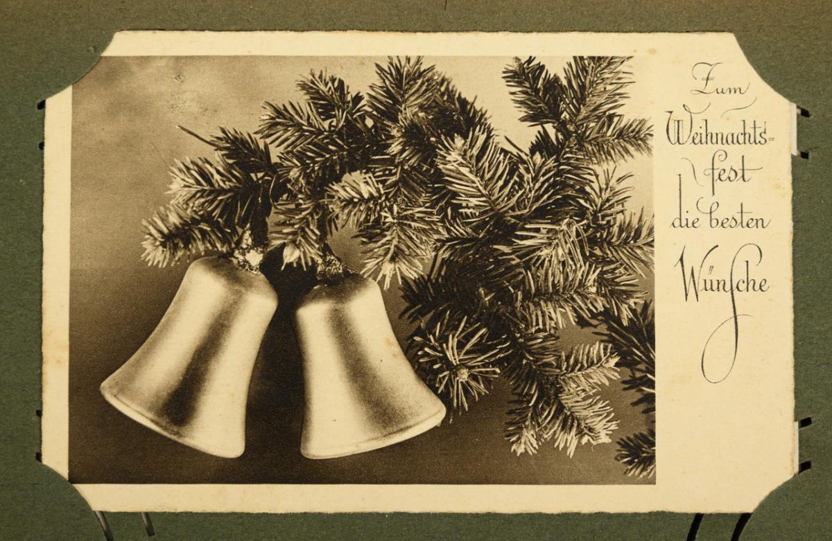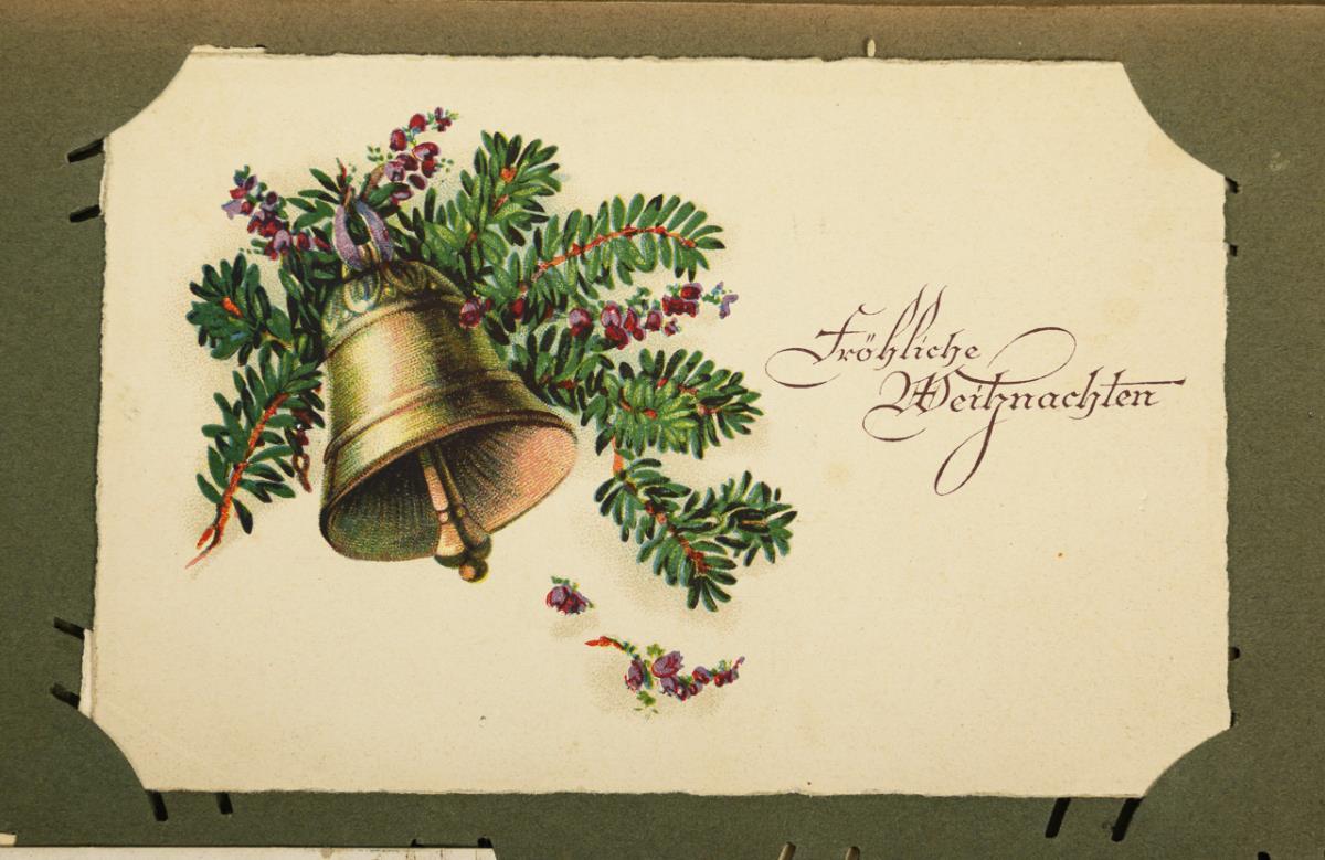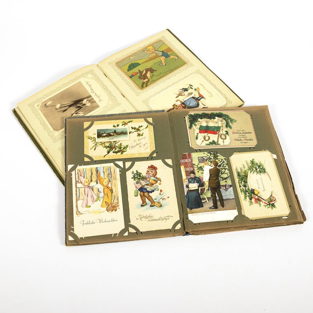 Greeting cards mostly for Christmas and Easter. Greenish or blue-grey album, each with floral motifs on the cover. Signs of age/use on the albums.
