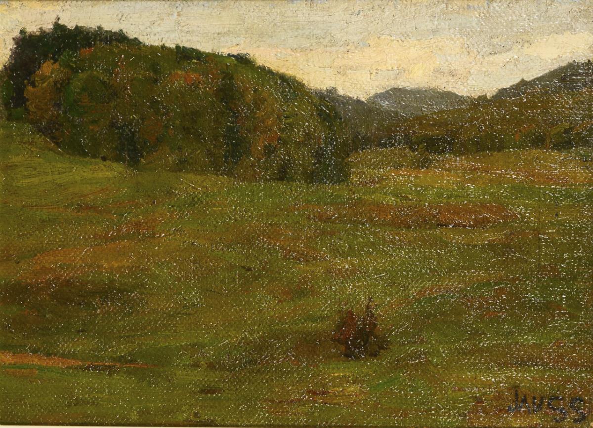 Hilly meadows in front of a wooded area under a cloudy sky. Small hole.