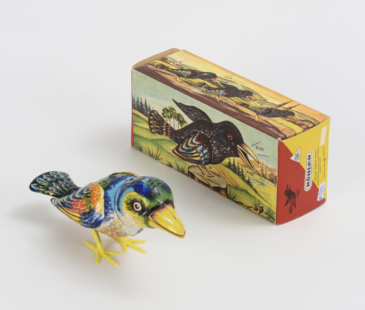 Hopping raven with yellow plastic legs. Work intact, with key. Comes with original box. Hardly used.