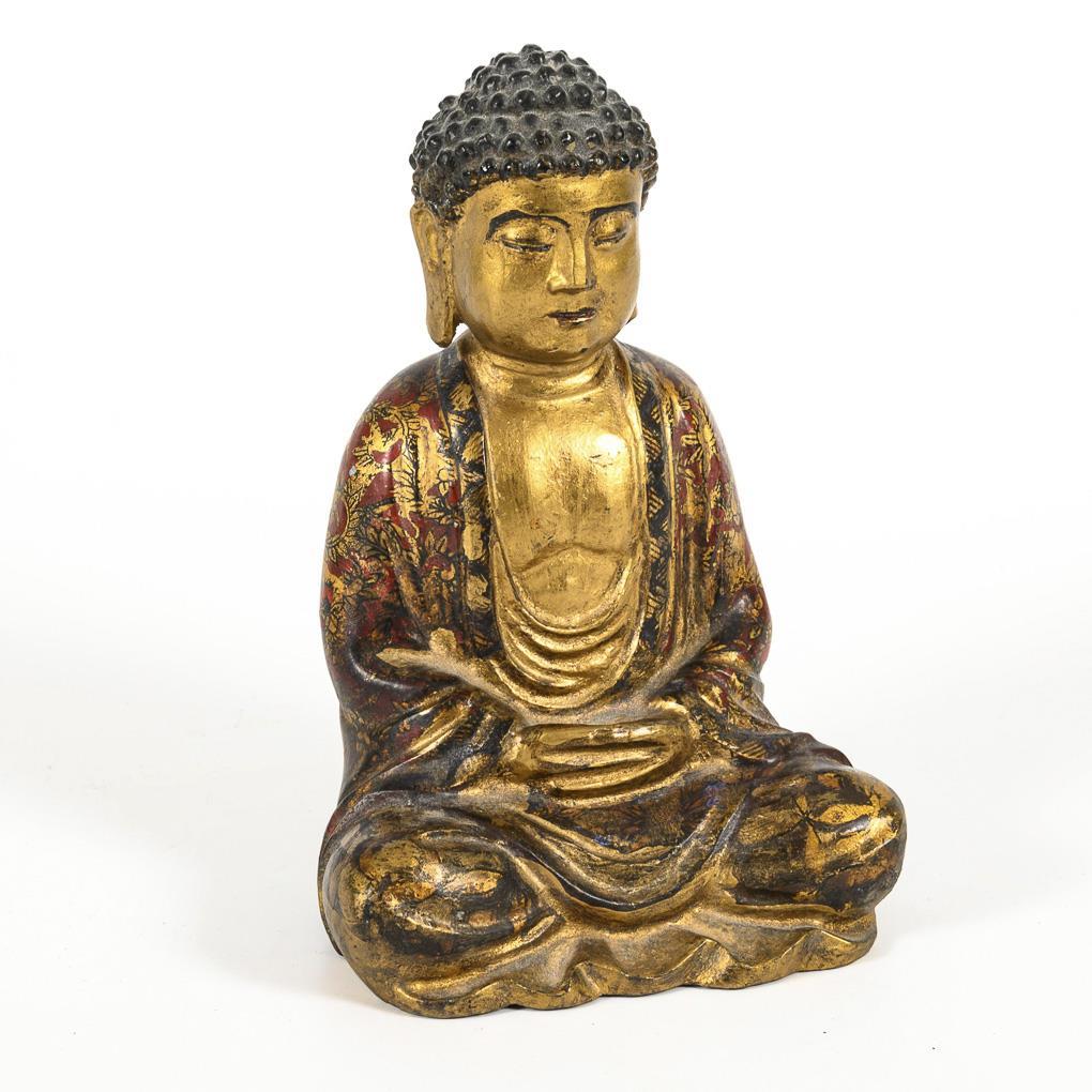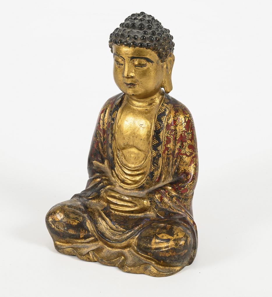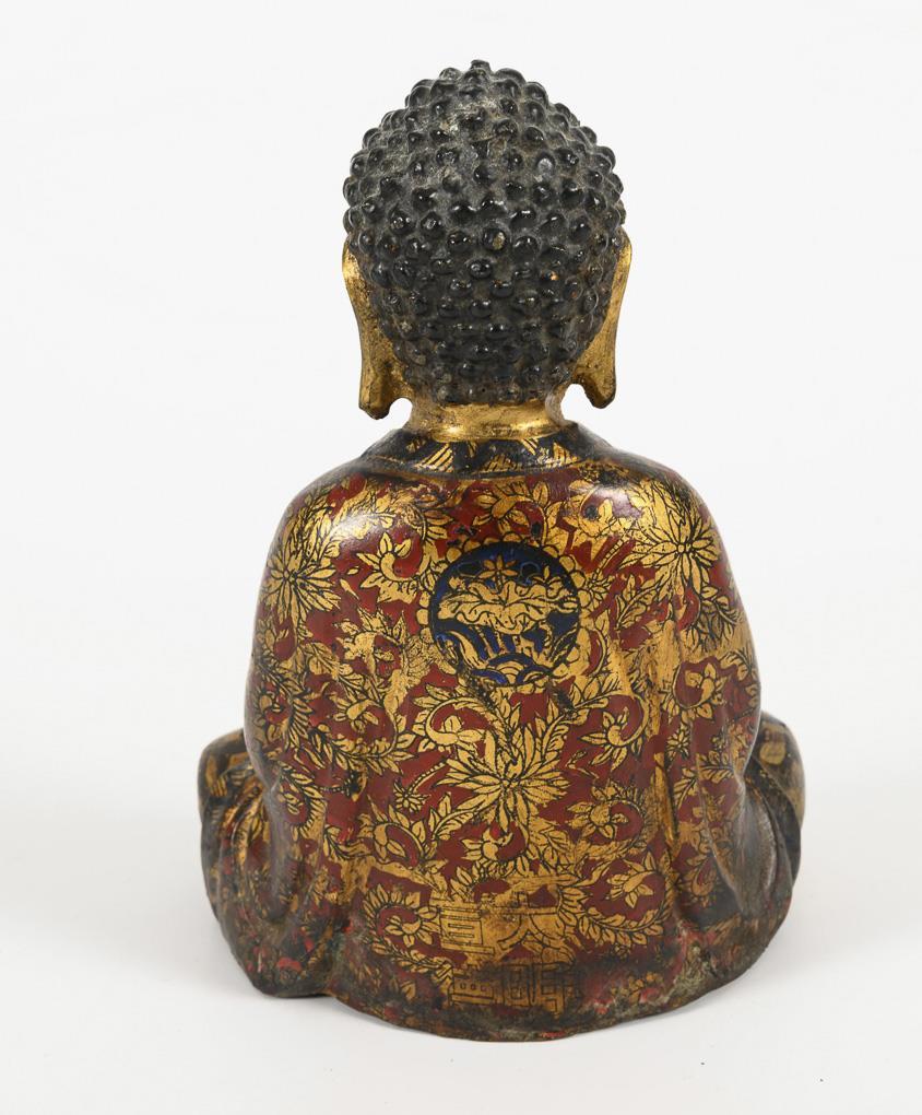 Meditating Buddha in an entangled seat, in a finely painted cloak with tendrils in black, red and gold and with characters on the reverse. Parts rubbed, with traces of age.