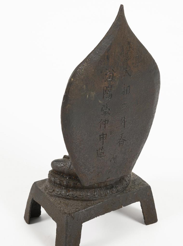 Seated Buddha on a double lotus throne and raised base. With large aura and the gesture of touching the earth and a vase in his hand. Inscription block on the back of the aura. Blackened, with an even, faint corrosion scar surface.