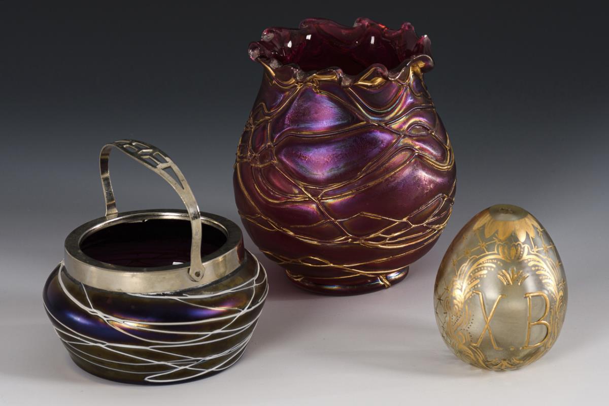 1x bulbous vase of clear glass with purple inner rim, woven with clear thread, iridescent (h 14 cm). / 1x bulbous vase made of violet glass, woven with opal white threads, metal-mounted rim with bow handle, iridescent (H total 10 cm). / 1x Russian Easter egg with enamel-painted bouquet of flowers, ornamental gold painting and the Cyrillic relief letters "XB" (= Христос воскресе [Christ is risen]) (H 8.5 cm).