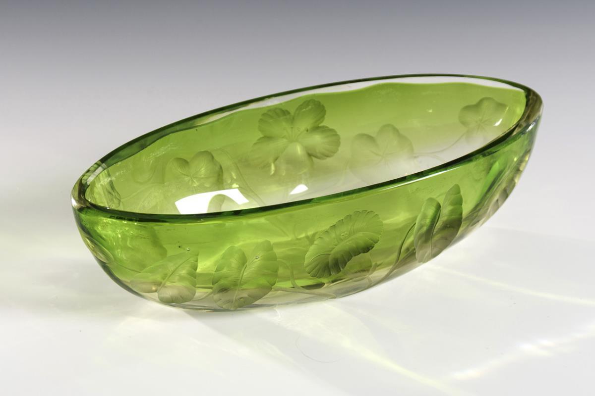 Colorless glass with green inner rim. L 25 cm.