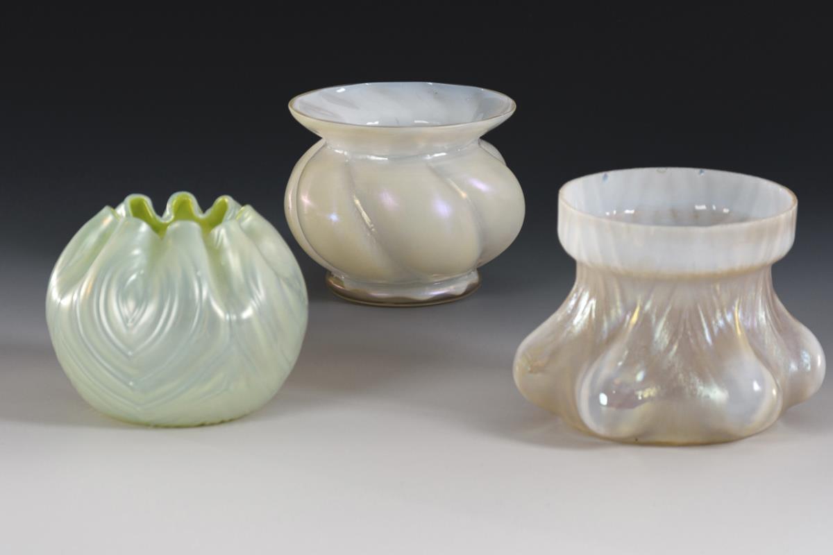 1x bulbous, oblique optically blown vase of colourless glass with opal white inner rim, iridescent (H 9 cm). / 1x vase made of colourless, optically blown glass with six-pass stand and cylindrical mouth, iridescent (H 9.5 cm). / 1x spherical vase made of ribbed optically blown opal glass with green inner rim, iridescent (H 8.5 cm). 1x mouth rim chipped.