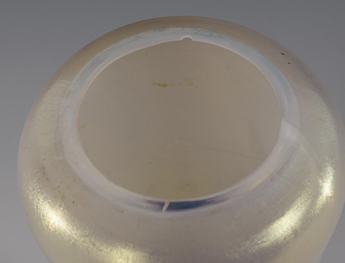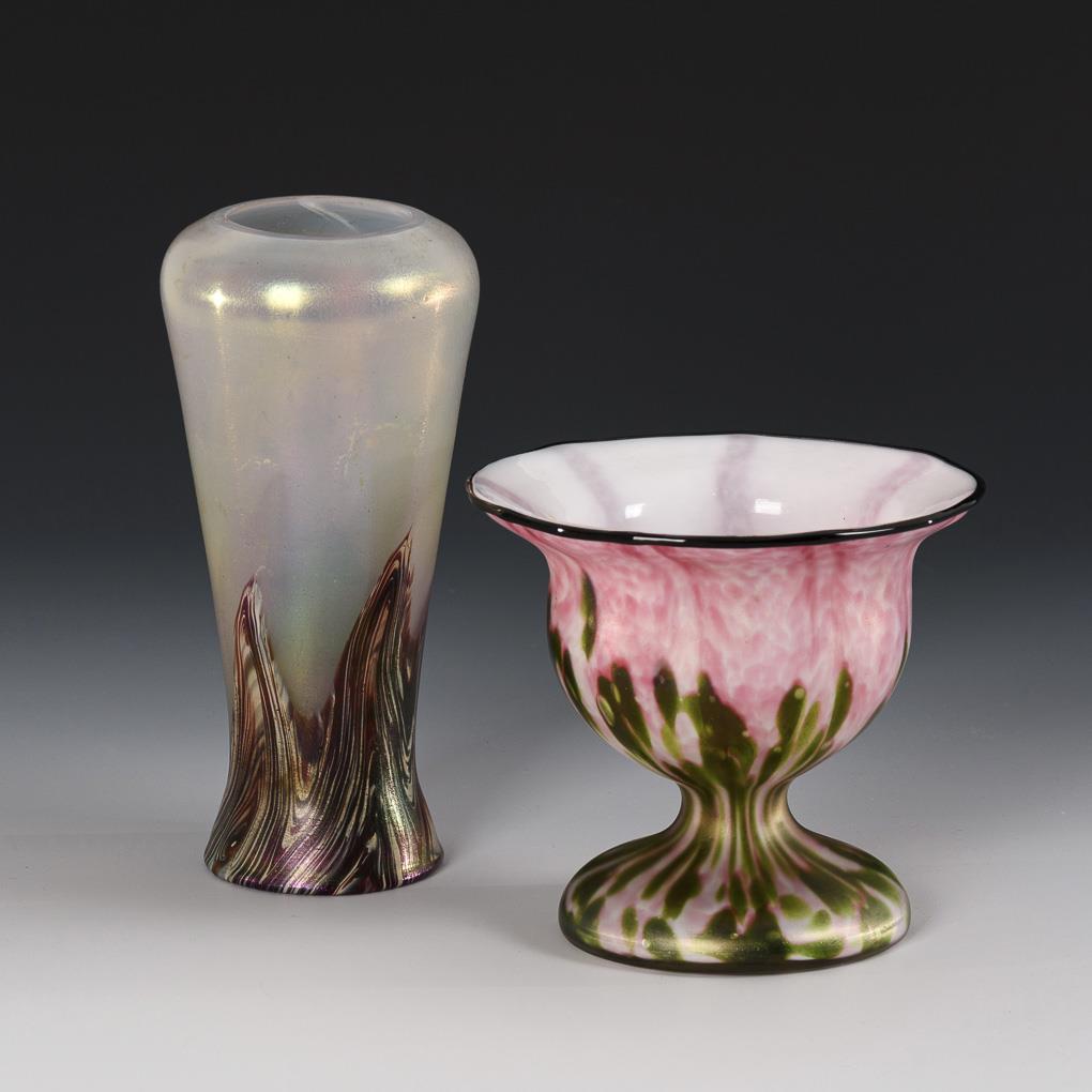 1x Fritz Heckert, Petersdorf/Schlesien, around 1903: Baluster vase made of opal glass, from the stand jaggedly extended overlays of opaque white-ruby red marbled overlays (H 17 cm). / 1x footed bowl of colorless glass with frosted glass interior, pink and green powder meltings in the intermediate layer and melted black thread on the edge of the mouth (H 11.5 cm). Bump on the edge of the baluster vase.
