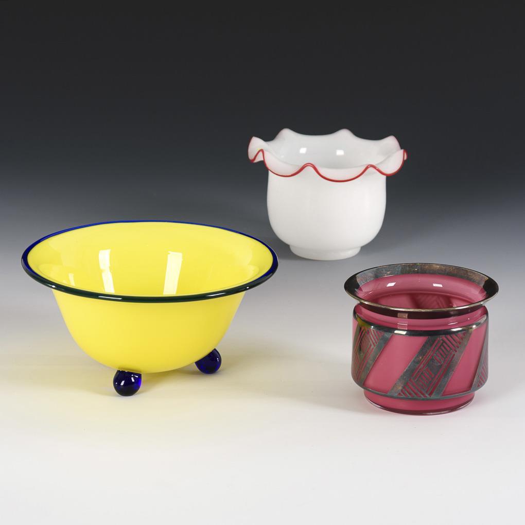 1x Tango glass, Johann Lötz Witwe, Klostermühle, circa 1920/30: Crater bowl made of colorless glass with opal yellow inner rim and three spherical feet and rim made of cobalt blue glass (H 8.5 cm). / 1x bowl of white alabaster glass with red thread fused to the rim (H 8.5 cm). / 1x Tango glass, cylindrical vase made of colorless glass with pink inner rim and geometric galvanic silver overlay (H 7.5 cm).