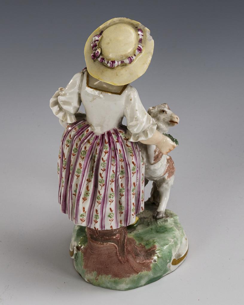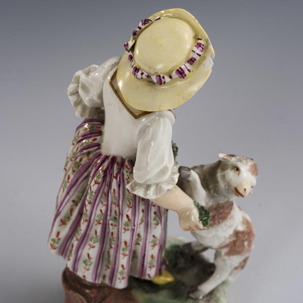 Girl standing on a natural plinth with a grass-filled apron, feeding a lamb jumping up at her. Hat rim and tuft of grass in the right hand bumped.