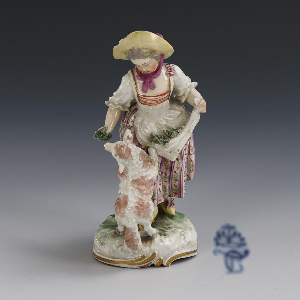 Girl standing on a natural plinth with a grass-filled apron, feeding a lamb jumping up at her. Hat rim and tuft of grass in the right hand bumped.