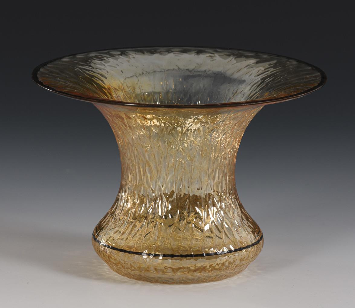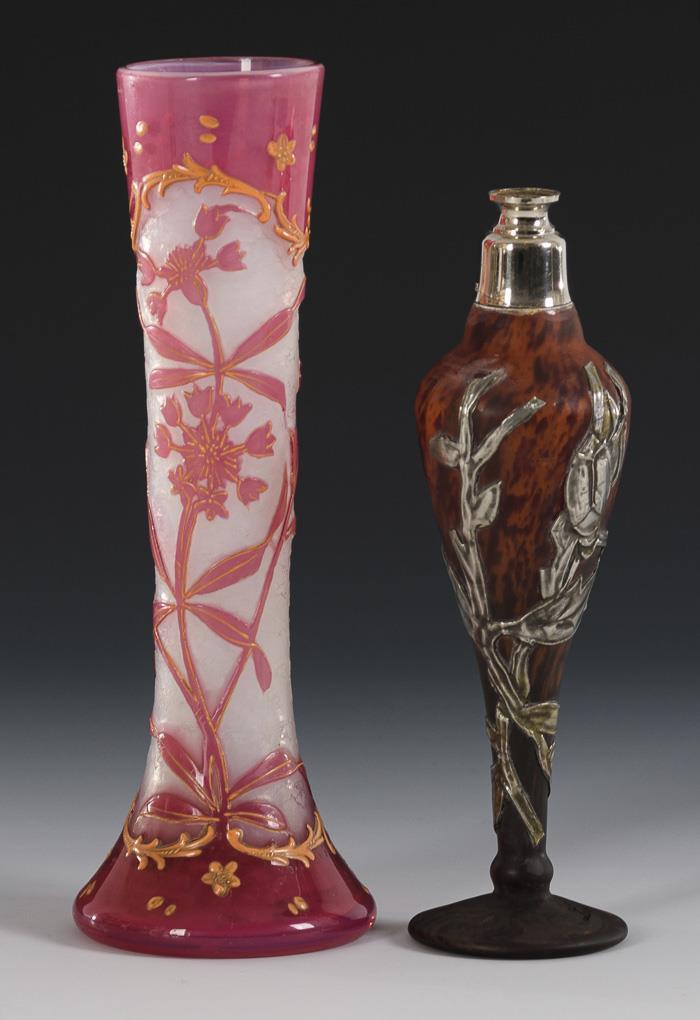 1x around 1900: crater vase made of colourless, martelé-optically blown, iridescent glass (h 10.5 cm). / 1x c. 1900/20: Rod vase of colorless glass with opal white inner rim and pink overlay, etched floral decoration and orange relief enamel painting (h 20.5 cm). / 1x Verreries d'Art Lorrain, signed, 1926/27: Club vase made of clear glass with brown and orange powder enamel, floral silver overlay and metal-mounted rim with screw cap (cap missing; h 18 cm).