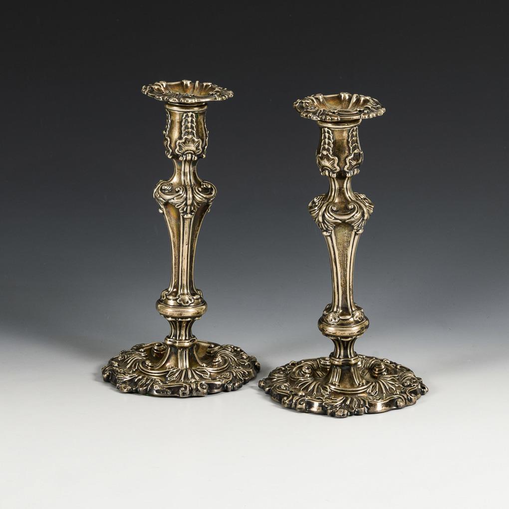 Pair of 1-light candlesticks with rich relief decoration. Signs of wear, 1x shaft compressed (slanted).