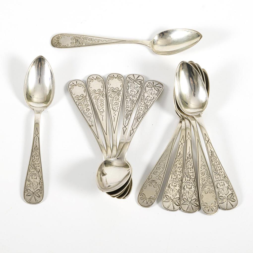 6 + 6 silver coffee spoons in case.