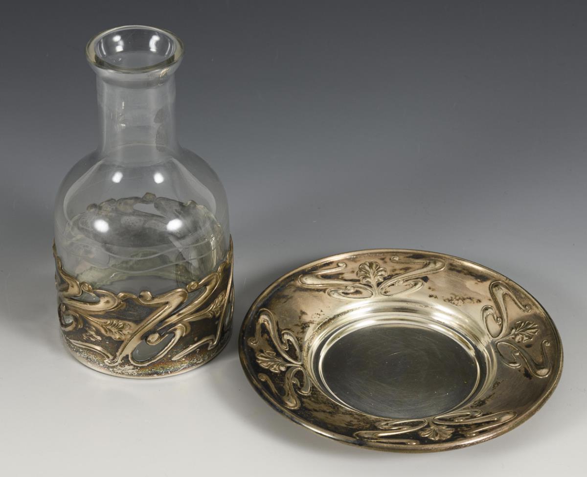Flacon (without stopper) with metal mount in relief, on matching saucer. Signs of wear, somewhat rubbed.