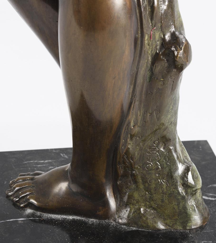 Bronze with brown and green patina, black marble plinth. Marked. H 67 / 72 cm. 14.1 kg.