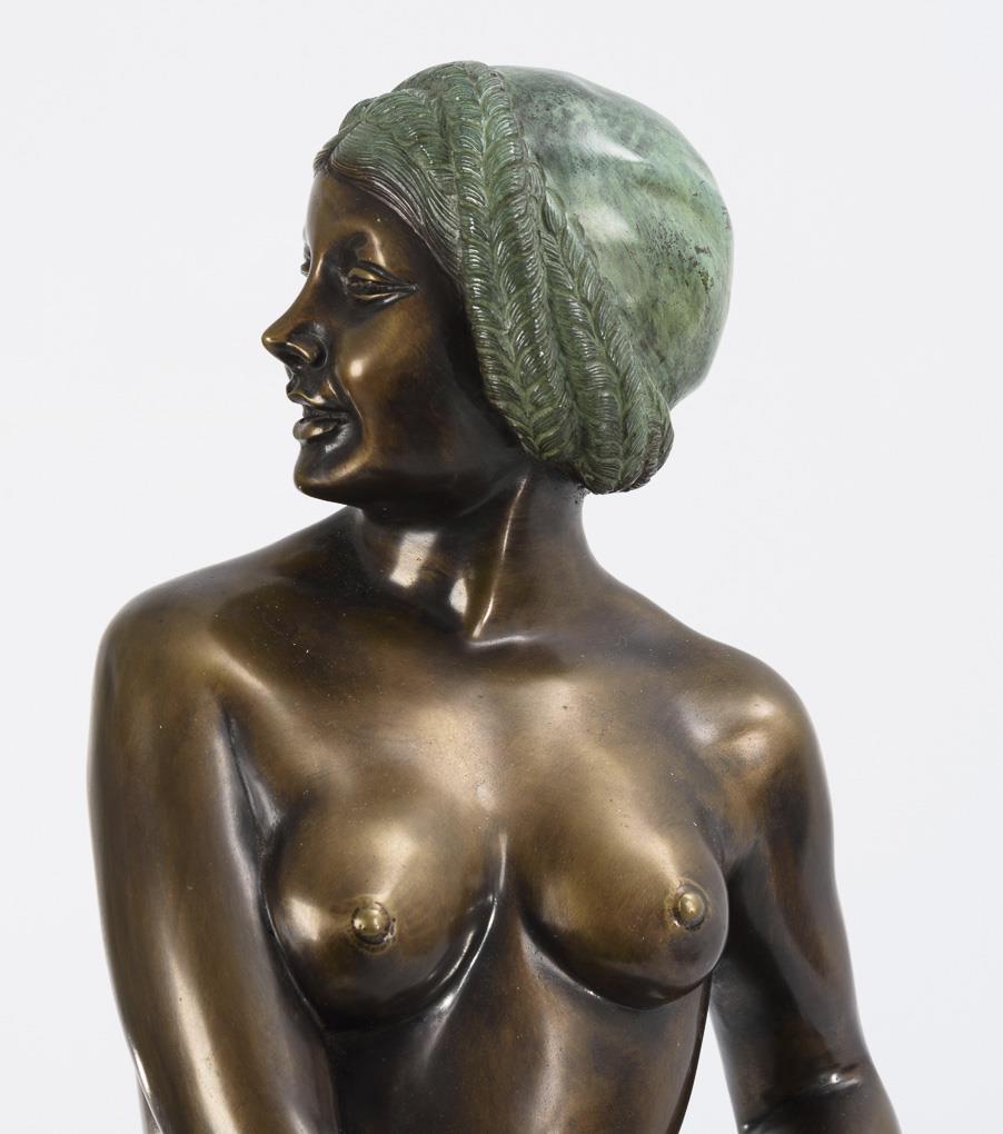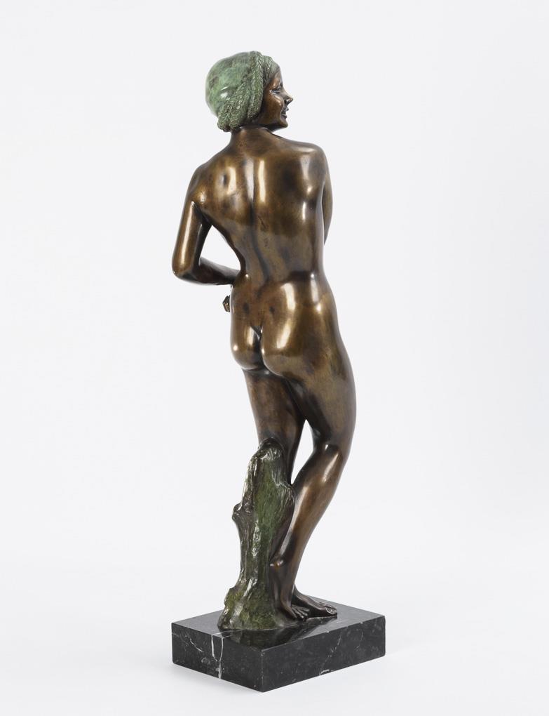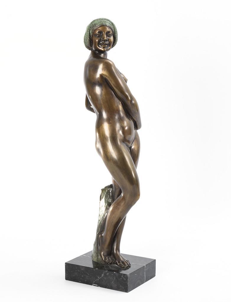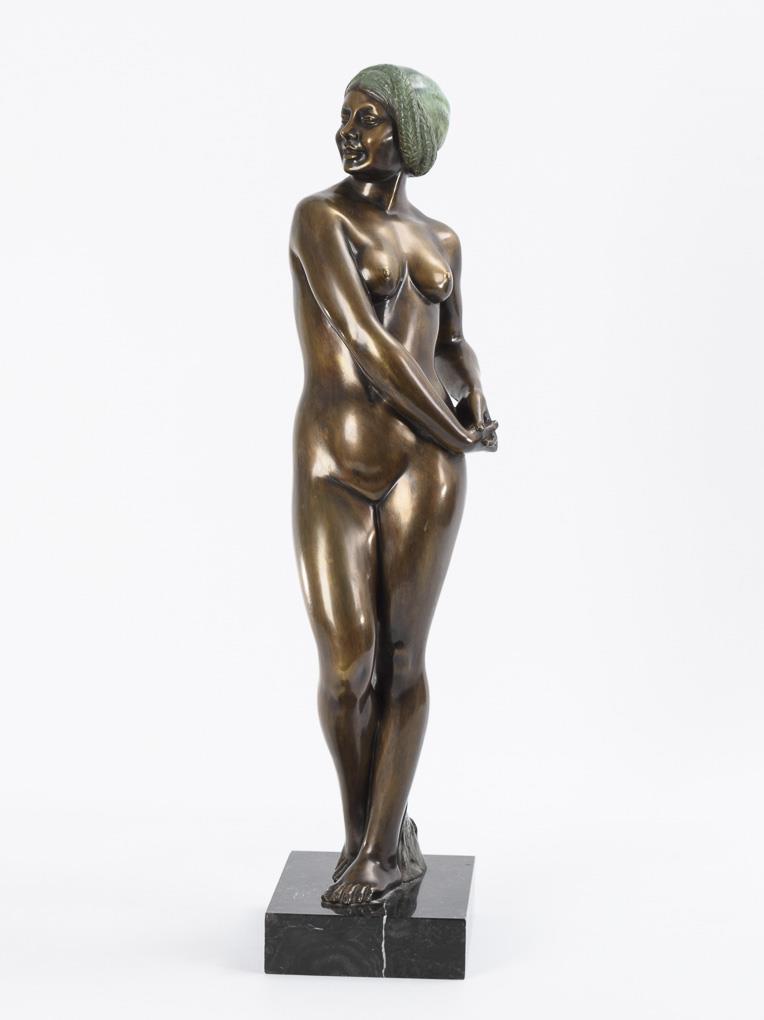 Standing nude of a young woman laughing and looking over her shoulder in a charming twisted pose. Patina somewhat rubbed on the back of the head.