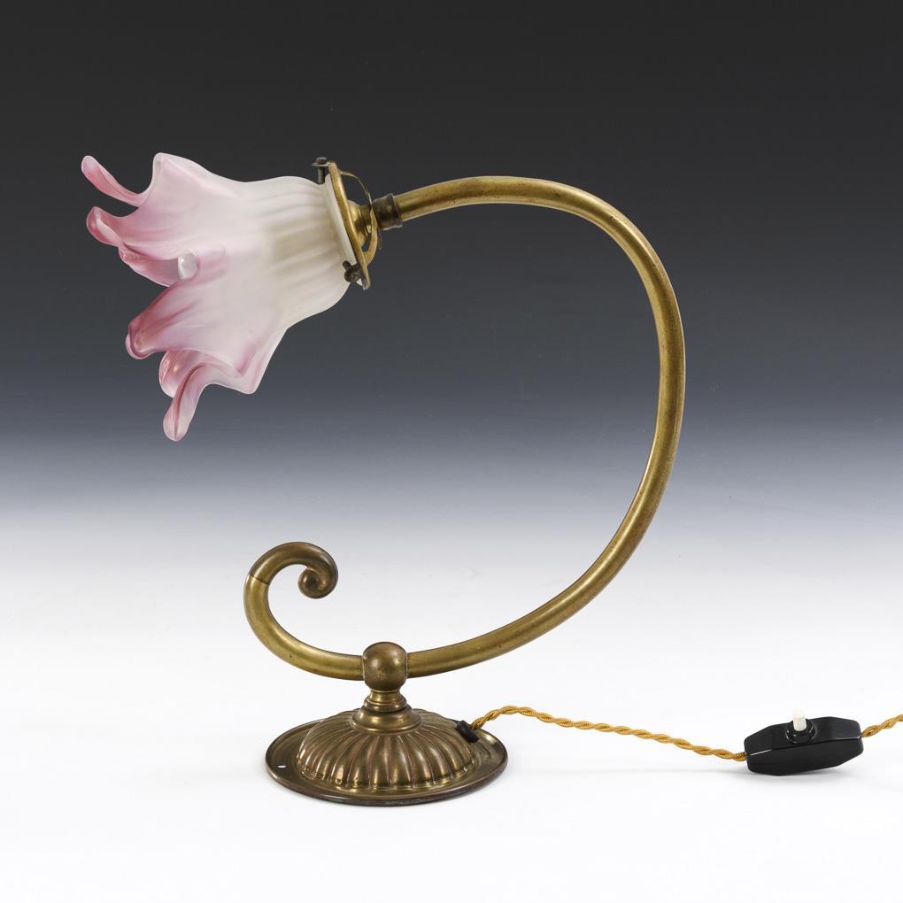 Ribbed round wall mount, curved arm with volute, glass shade in the shape of a flower; bayonet mount. Arm probably slightly bent, recently wired.