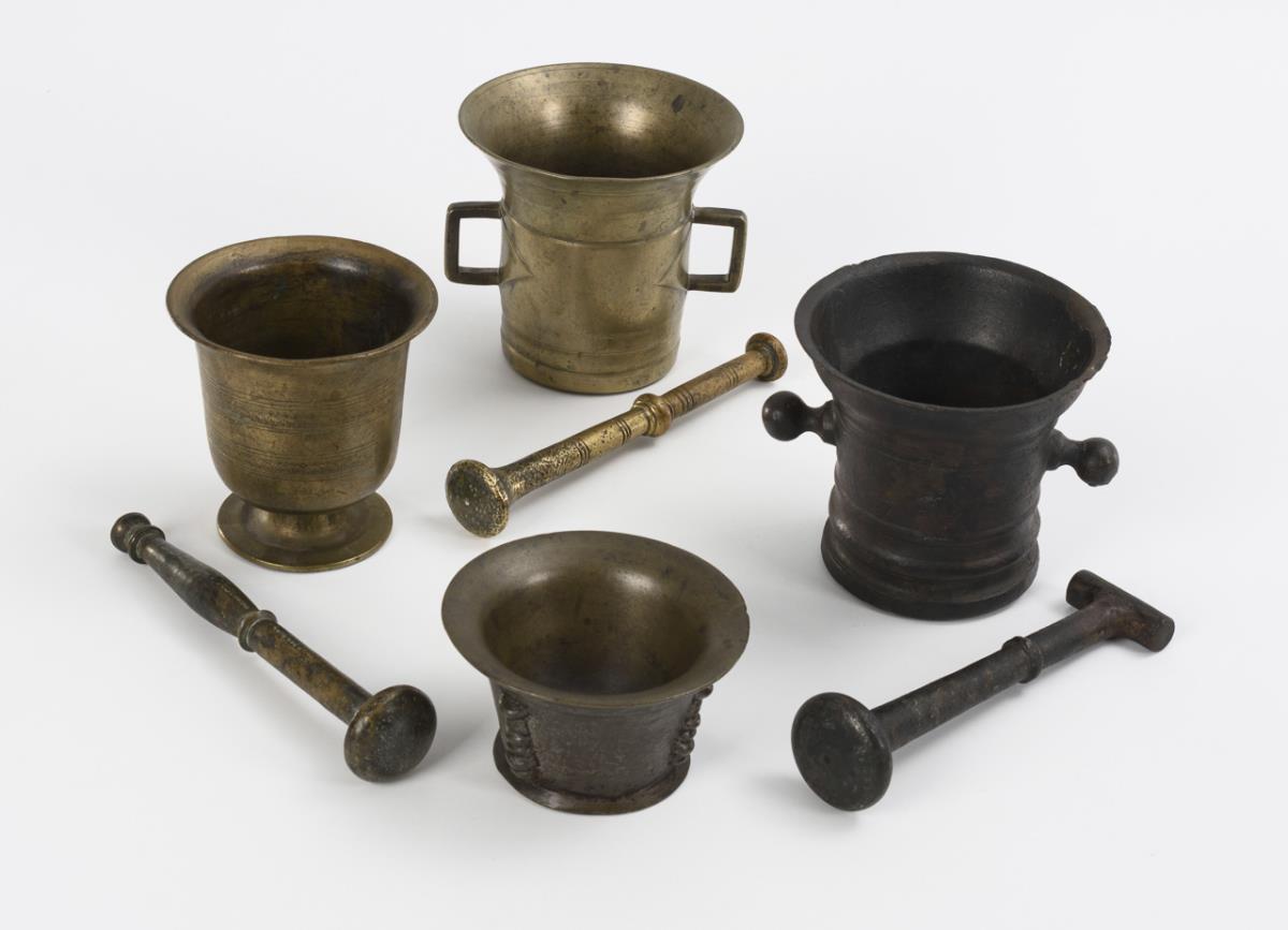 1x with 2 knobs and bead and throat profiles, stamped number "1762" on the base. Comes with 1 crutch pestle / Mortar with 2 angled handles and protruding narrow lip; decorated pestle / Beaker-shaped mortar with 2 palmette friezes, probably also cast, flanked by lines. Comes with pestle with whorl and pommel. / Probably Spanish mortar with 3 ribs. Dated mortar: slightly domed base, knocks and repairs to the lip. / Spanish mortar: casting defects, hairline crack to the lip. / 1 pestle with heavy signs of use.
