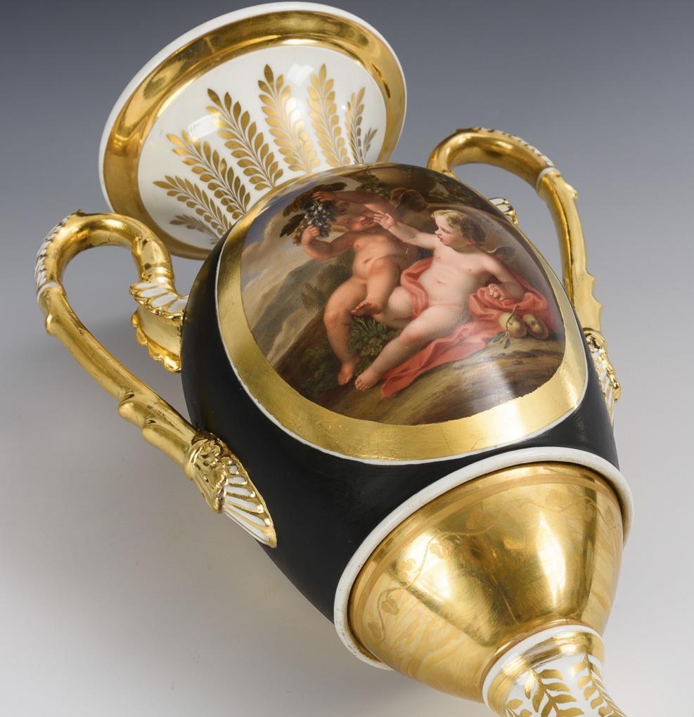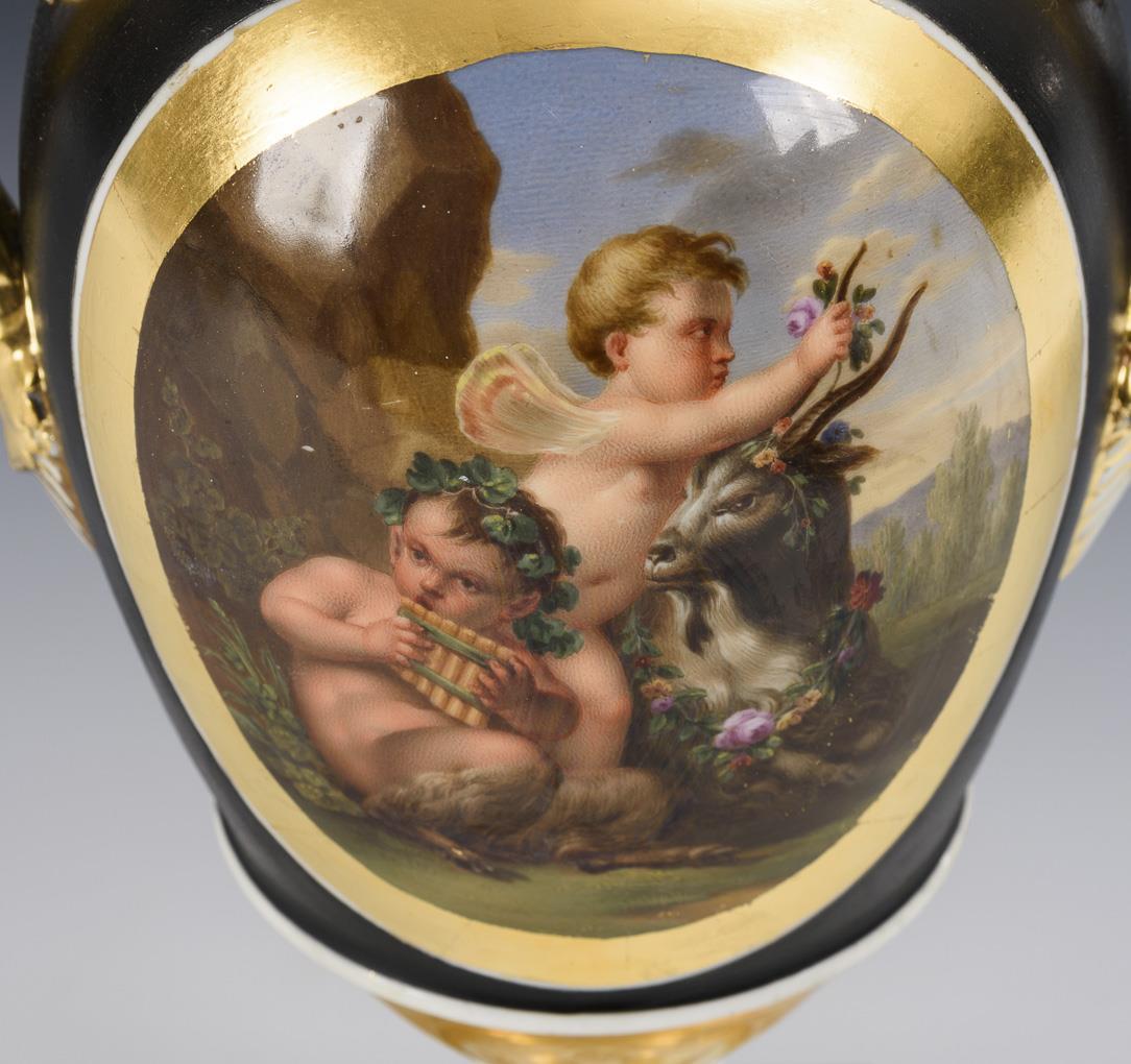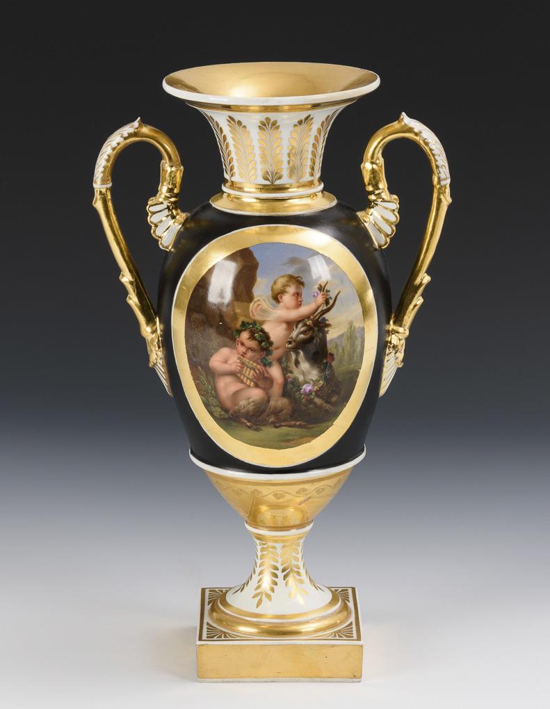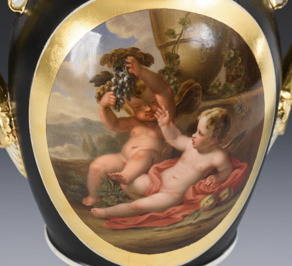 Ovoid body with two palmette handles, crater neck and round foot, on a square plinth. Black ground, on both sides an ovoid cartouche with the finely painted depiction of a pair of putti reclining in a landscape with grapes and apples and a bacchante with a panpipe, an elf and a billy goat. Body, handle and foot restored.