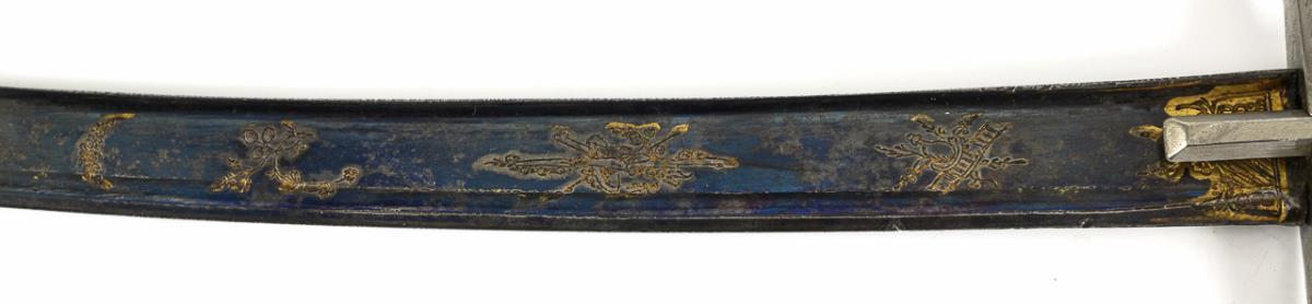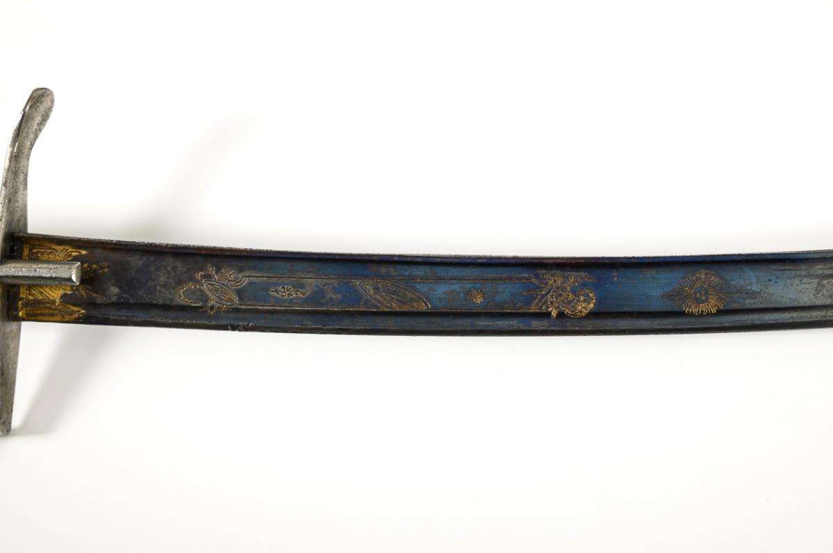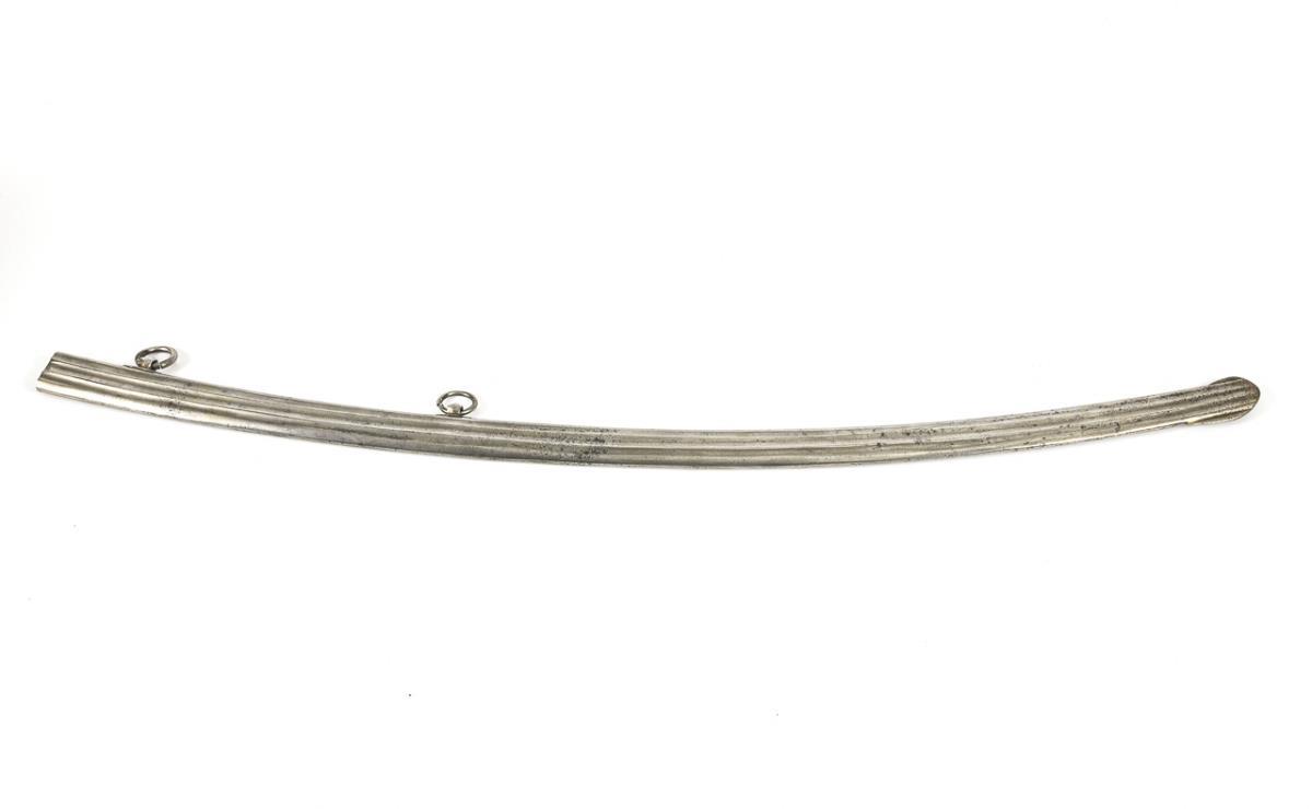 Heavily curved, single-edged blade with pommel point, reinforced back and two narrow fullers. Lower third blued and engraved, partially gilt. Iron hilt with bird's head pommel and oval in the flat guard. Leather grip with twisted wire. Metal scabbard smooth on one side, triple fluted on the other. Two movable rings. Scabbard with corrosion pits.