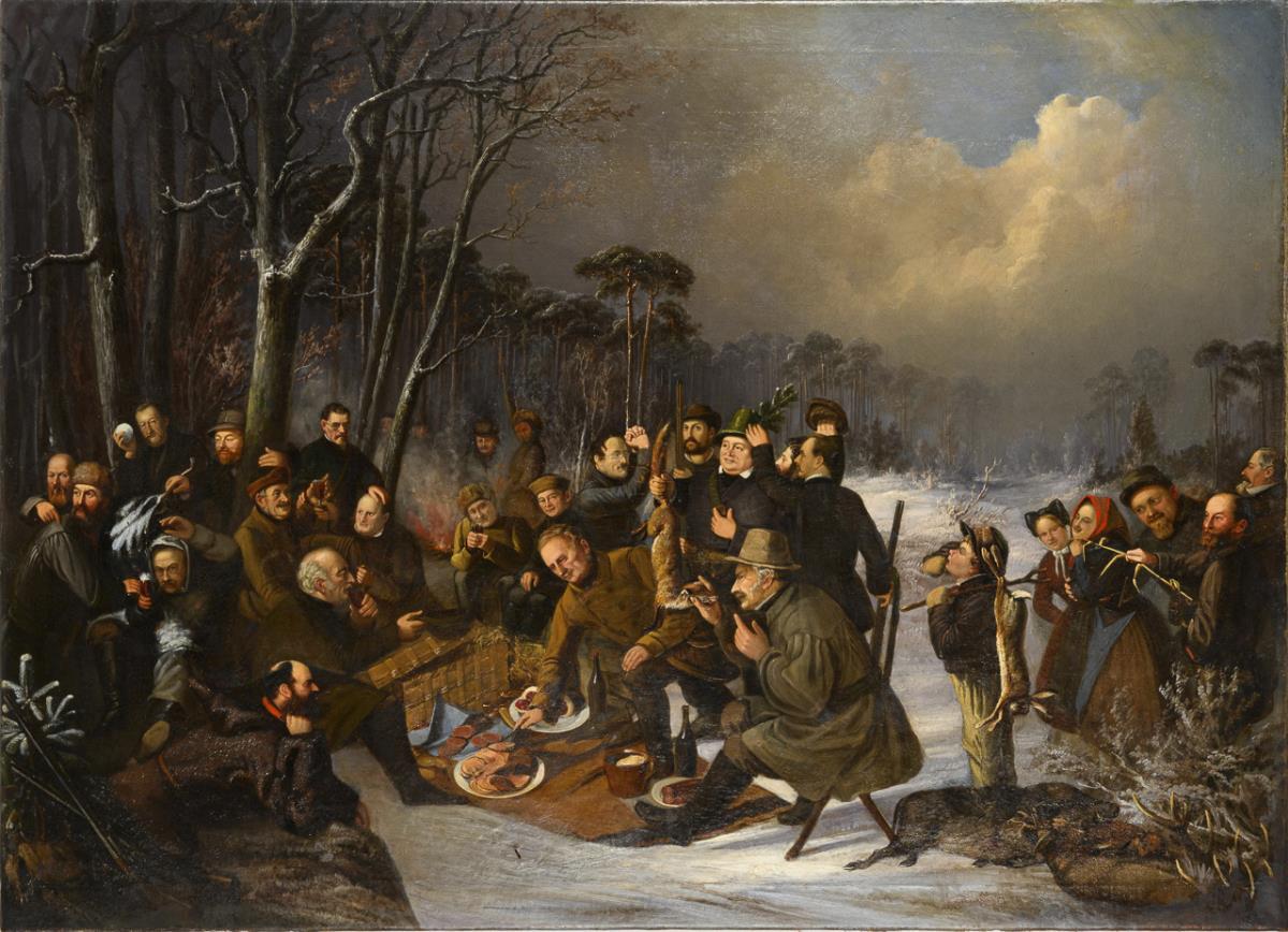 Exuberant mood after a successful hunt on a winter evening at the edge of the forest. Canvas with doubled edges, one defect.